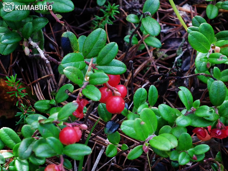 この写真はコケモモで、野鳥がついばんだと思われる実もあります。