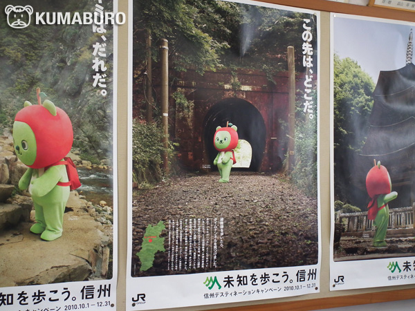 投稿日: 2010年10月6日2013年1月30日 投稿者: くまぱぱ赤いもの・3 赤いリンゴ型の帽子をかぶったくまです。なまえは、アルクマ。信州ディスティネーションキャンペーンのキャラクターです。 10〜12月の3ヶ月、JRによる信州ディスティネーションキャンペーンが行われています。小海駅に立ち寄った時、このポスターを見つけました。漆久保トンネルという、旧国鉄篠ノ井線の廃線跡にあるトンネルです。ウォーキングコースになっているそうなので、一度行ってみたいなぁ。