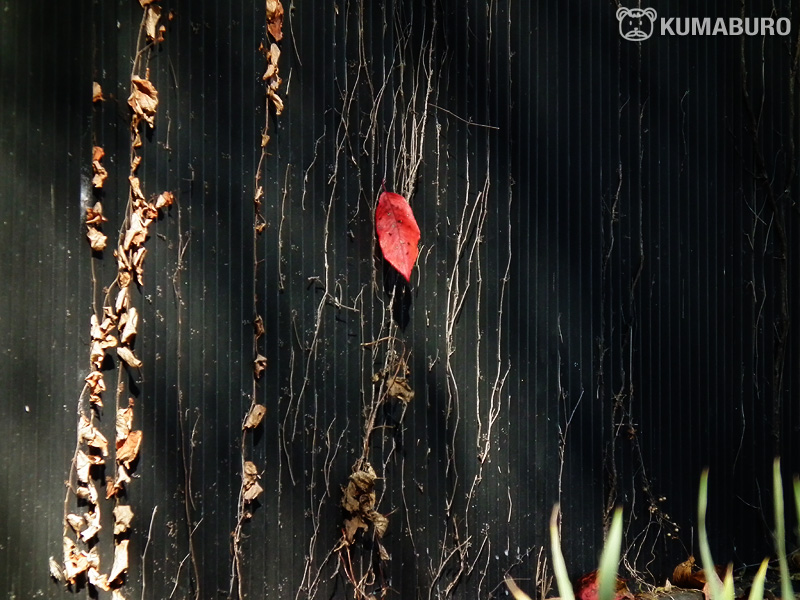 貼り付いた蔓草が枯れて、そこに舞い落ちた赤い落ち葉。