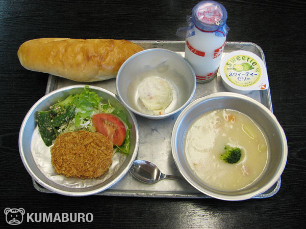 シチュー、コロッケ、野菜サラダ、ほうれん草のごま和え、ポテトサラダ、コッペパン、牛乳、ゼリーという献立ですが、アルミの器と先割れスプーンで、うまく昔の給食の雰囲気を出しています。