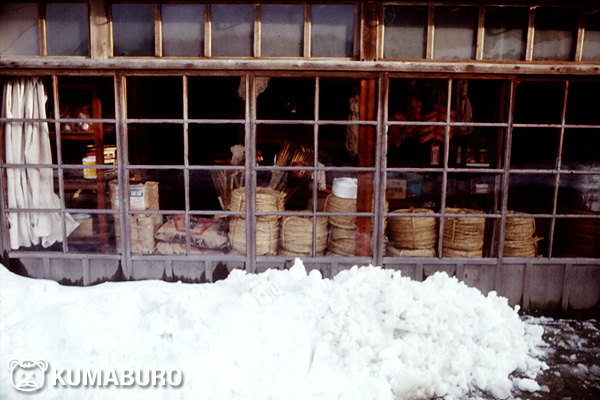 炭屋か荒物屋でしょう、荒縄、たどん、練炭・・その奥に竹の熊手などが見えます。