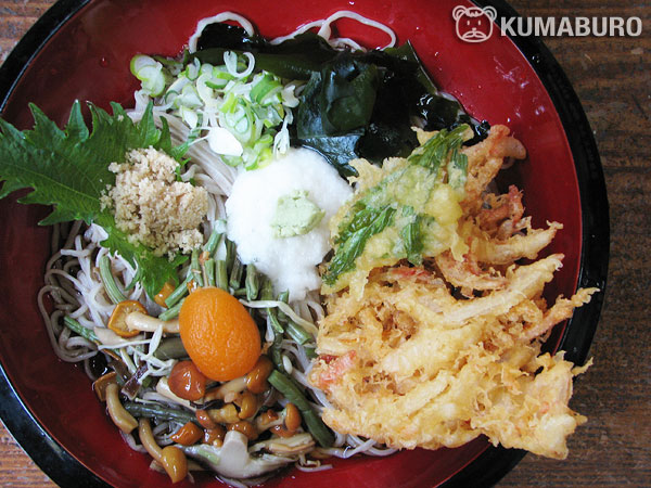 ネギ、ワカメ、大葉の天ぷら、小エビとタマネギのかき揚げ、ワラビ、しめじ、なめこ、干し杏子、大葉、挽き胡桃、とろろ、ワサビ・・と、盛りだくさんの具が乗った蕎麦です。