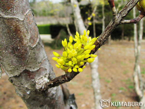 まるで自生しているかのように、雑木林のそこここでサンシュユの花が咲いています。
