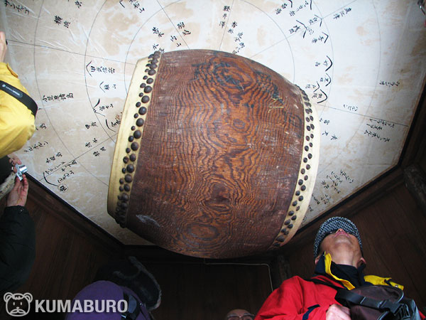 天井には太鼓が吊され、周囲の山の位置と、何と海外の都市の方向まで書かれています。