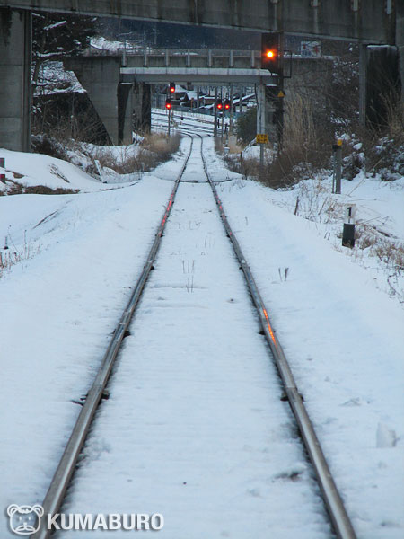 凍てついた線路が、雪の中を真っ直ぐに続いています。