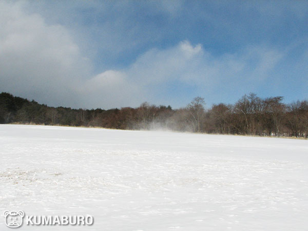 「シーニックデッキ」から雪の牧草地を眺めると・・