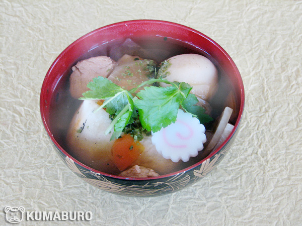 焼いた角餅、鶏肉、銀杏切りの大根と人参、里芋、鳴門巻き、三つ葉が入ったすまし醤油出汁で、食べる時に青海苔を振ります。