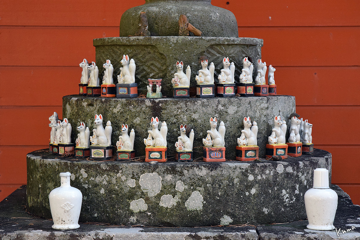 本殿前の石灯籠には、狐像がたくさん並んでいます。如何にもお稲荷さんの風景ですね。
