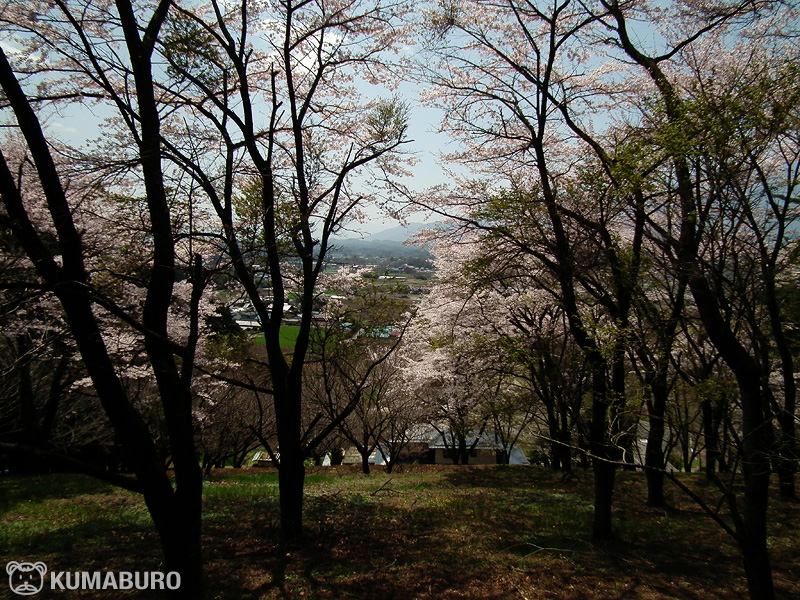 桜の枝越しに地域の集落や畑が見えます。
