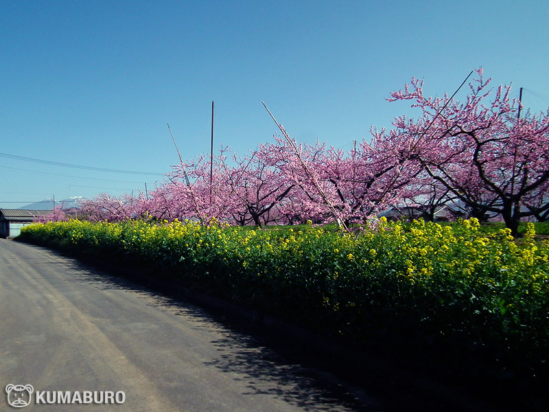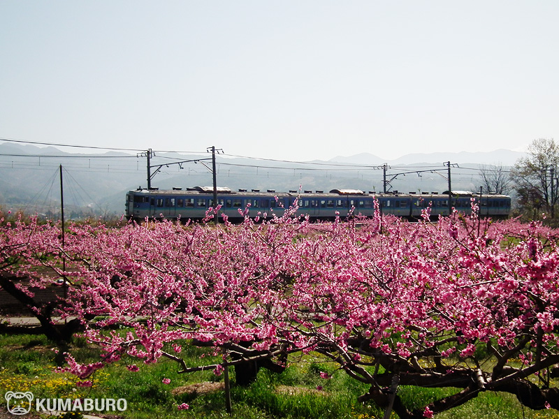 車窓から眺める桃畑は綺麗ですが、外から列車と桃の花を一緒に撮影できる場所は限られています。