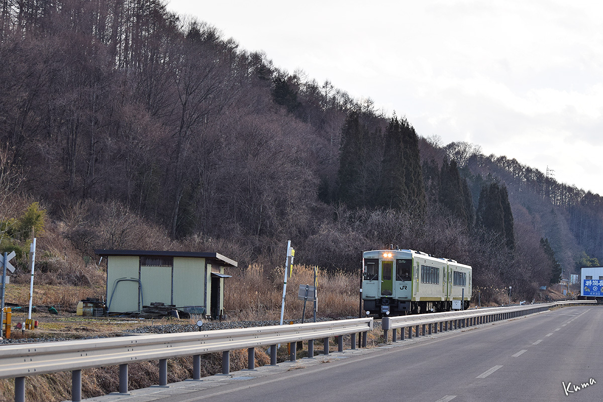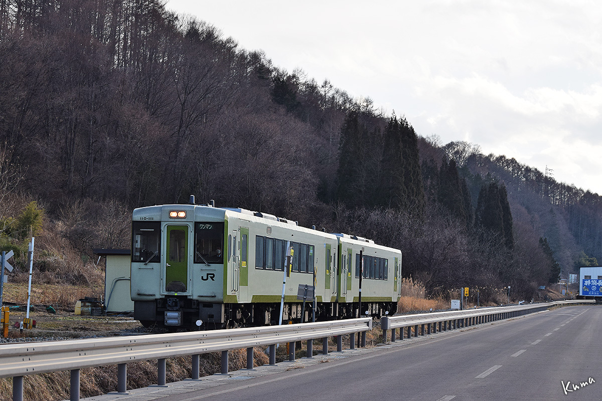 投稿日: 2023年1月14日2023年1月13日 投稿者: くまぱぱ直線区間の小海線列車 八千穂駅を発車した下り列車が走ってくる。 キハ110の2両編成だ。 ここは直線で視界も良く、ぐんぐん加速してくる。 もうそろそろ60km/hになるだろう。 更に加速しつつ迫ってくる。 この先に僅かなカーブがあるが、その先はまた直線区間で、小海線としては最高速度の85km/hに達する。