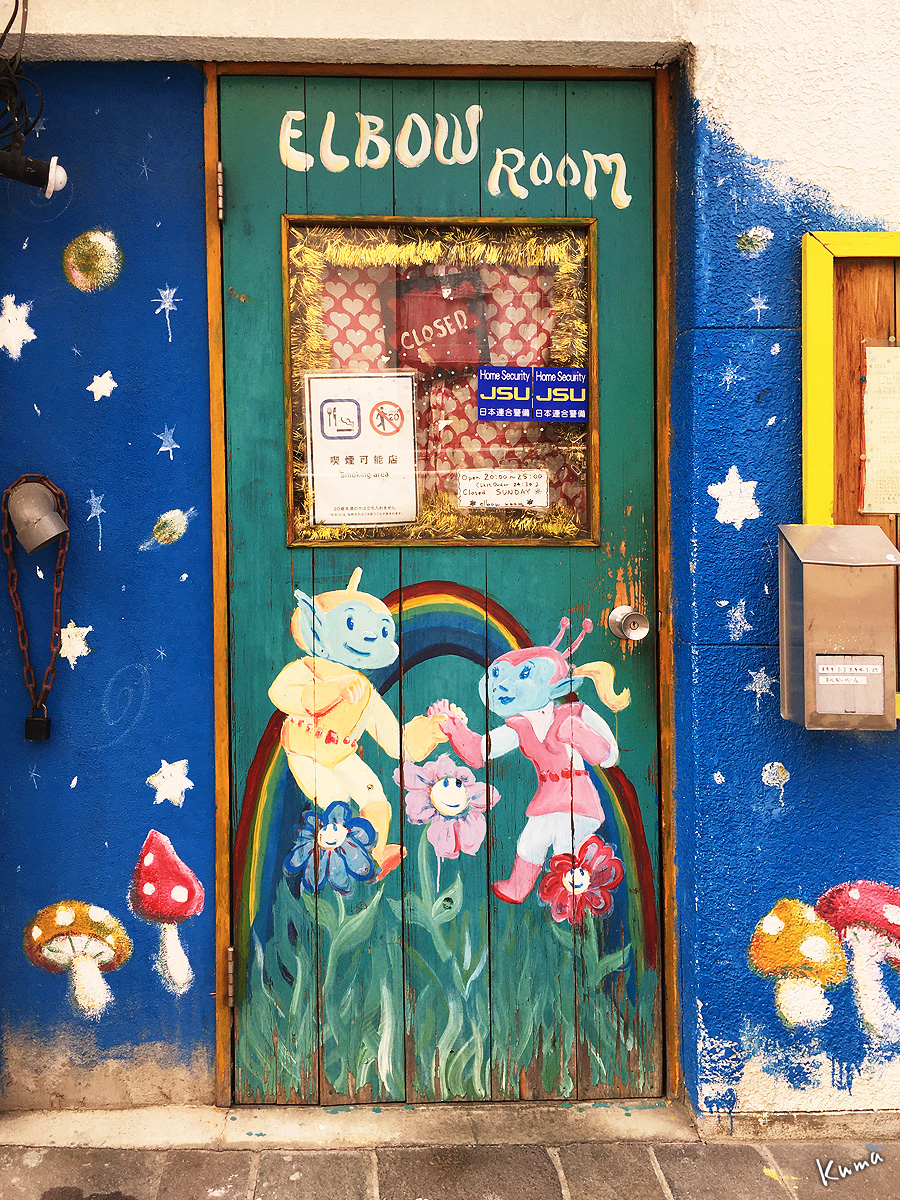 扉と壁面の絵が面白い。張り紙の営業時間を見る限り夜の店のようだが、扉の絵からダンスホールとも考えられる。