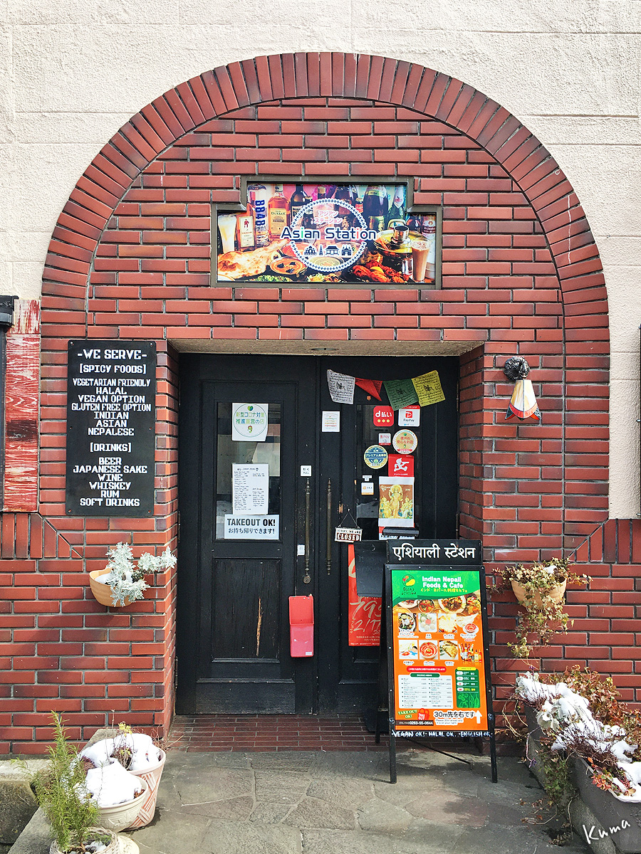 アジアンレストランのようだ。張り紙がたくさん貼られた黒い扉と、壁面のレンガタイルの貼り方がいい感じだ。