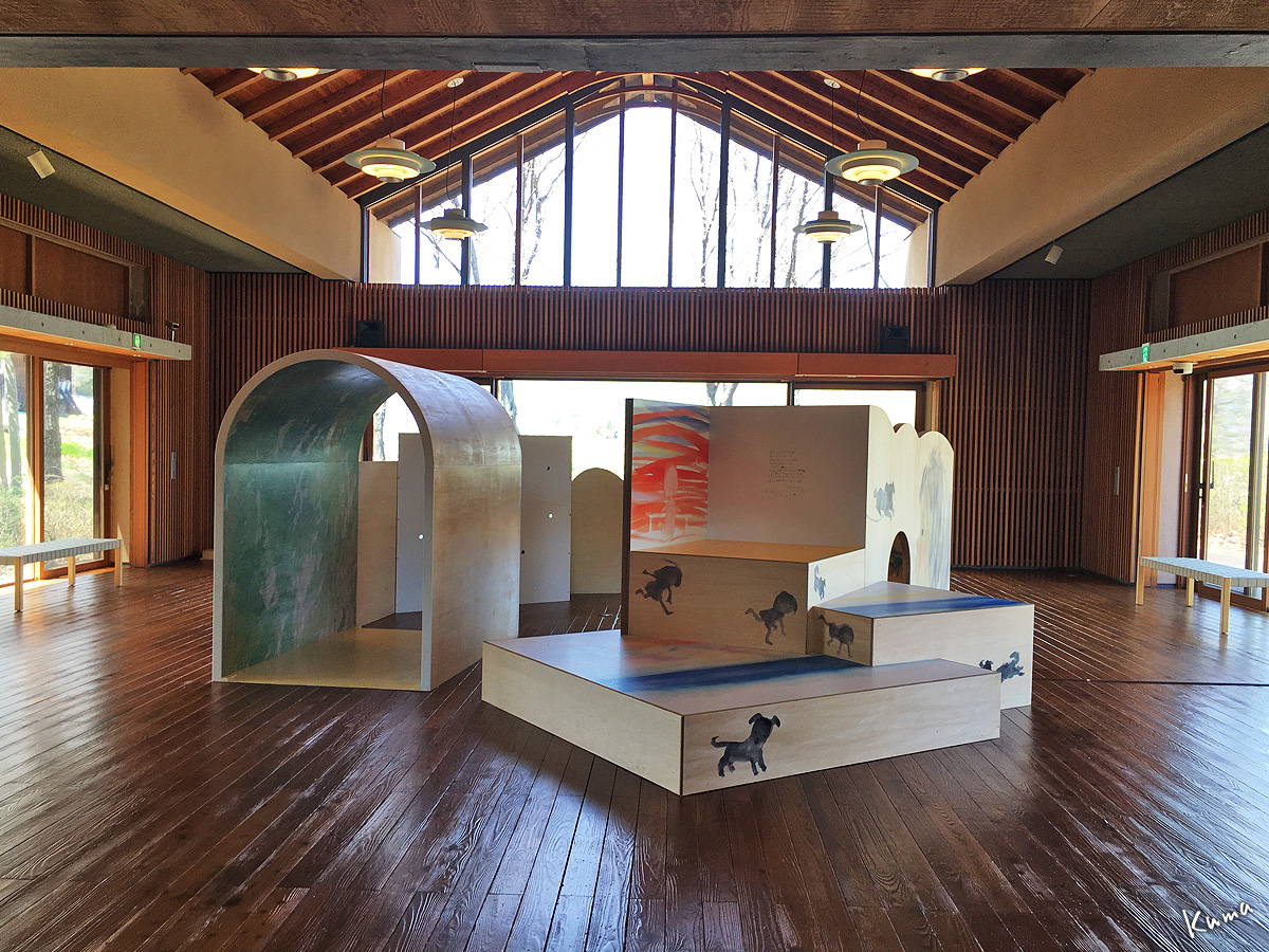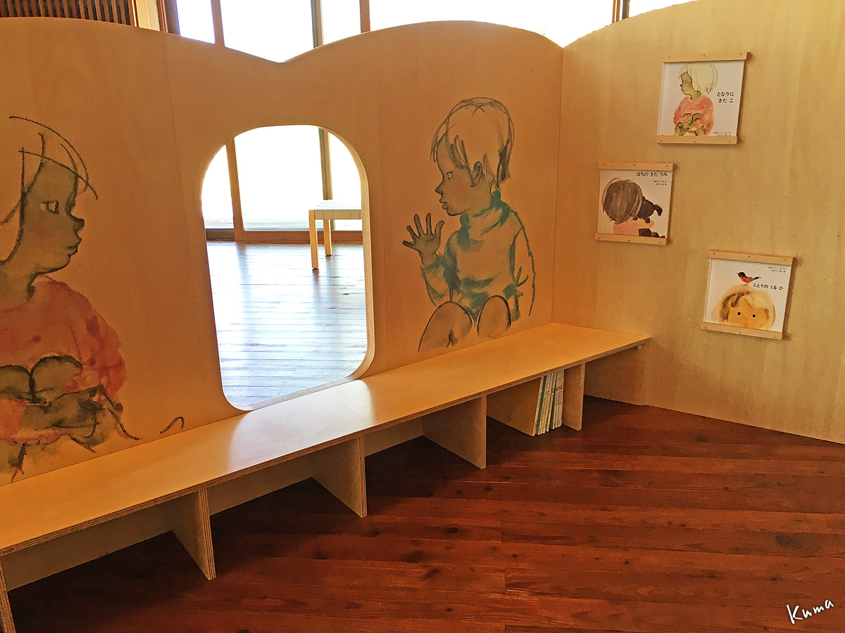 これは「絵本をみるための遊具」で、全体が木で作られた家というか秘密基地と言うか、壁面にはちひろの絵がプリントされている。