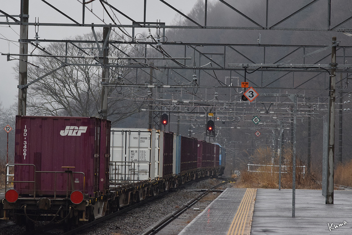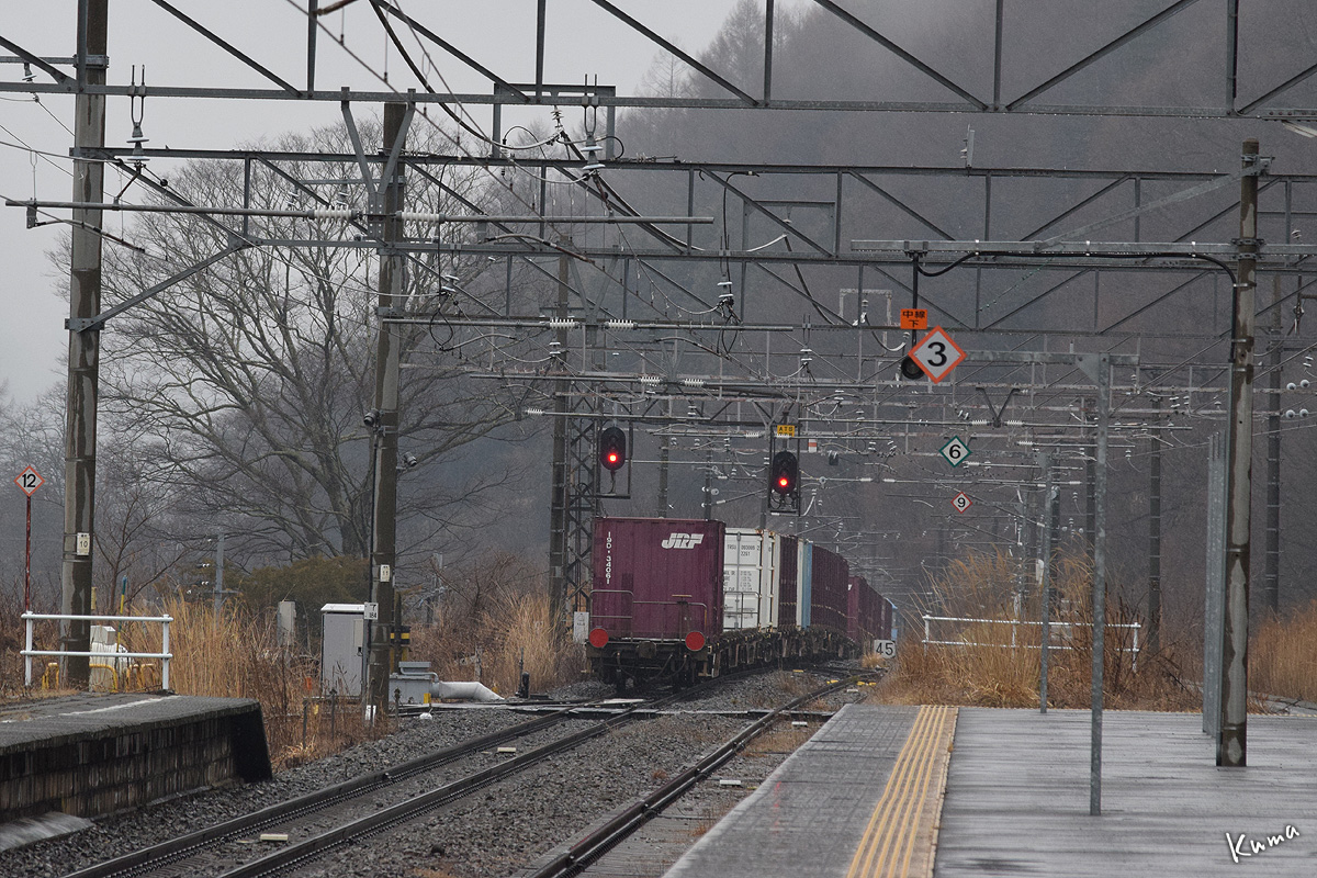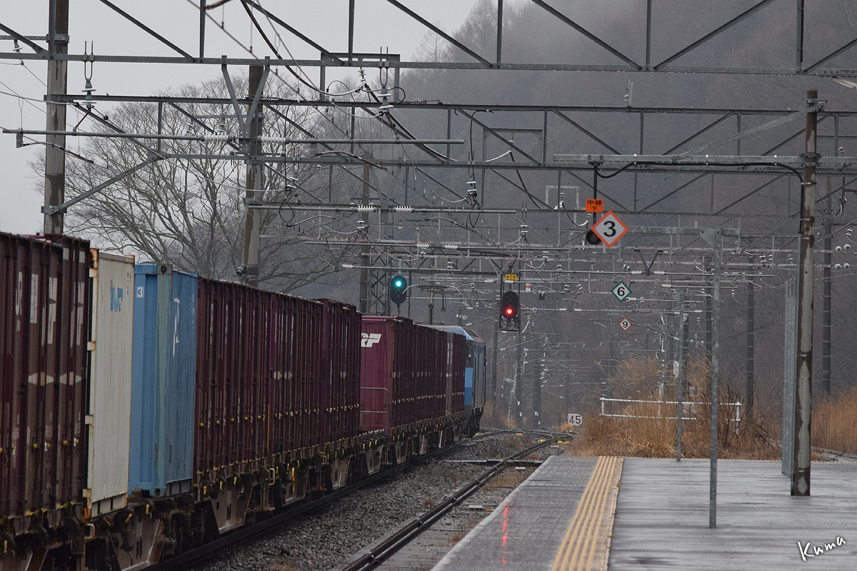 投稿日: 2024年5月5日2024年5月4日 投稿者: くまぱぱ雨中の貨物列車 EH200の牽引する下り貨物列車。 青柳駅を通過していく。 本線信号が赤に変わった。 信号機から先は下り勾配となる。 この先で左にカーブするが、このあたりで姿は見えなくなる。