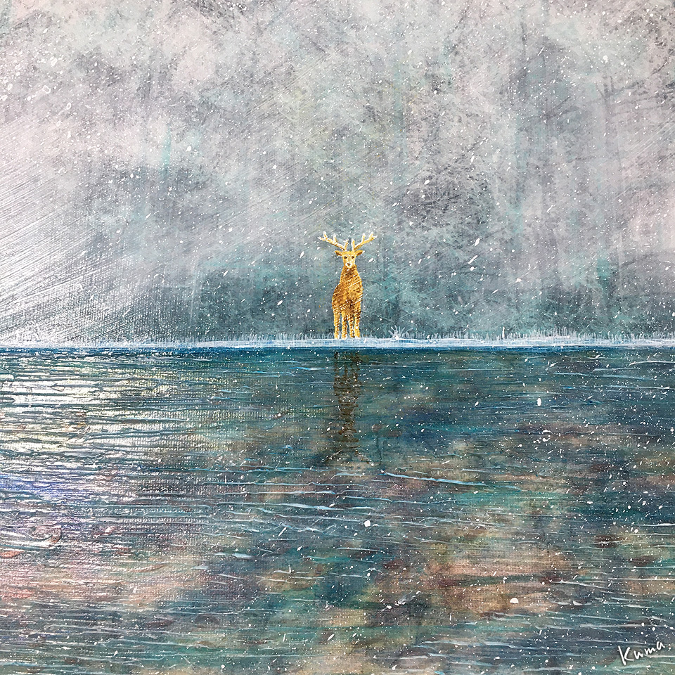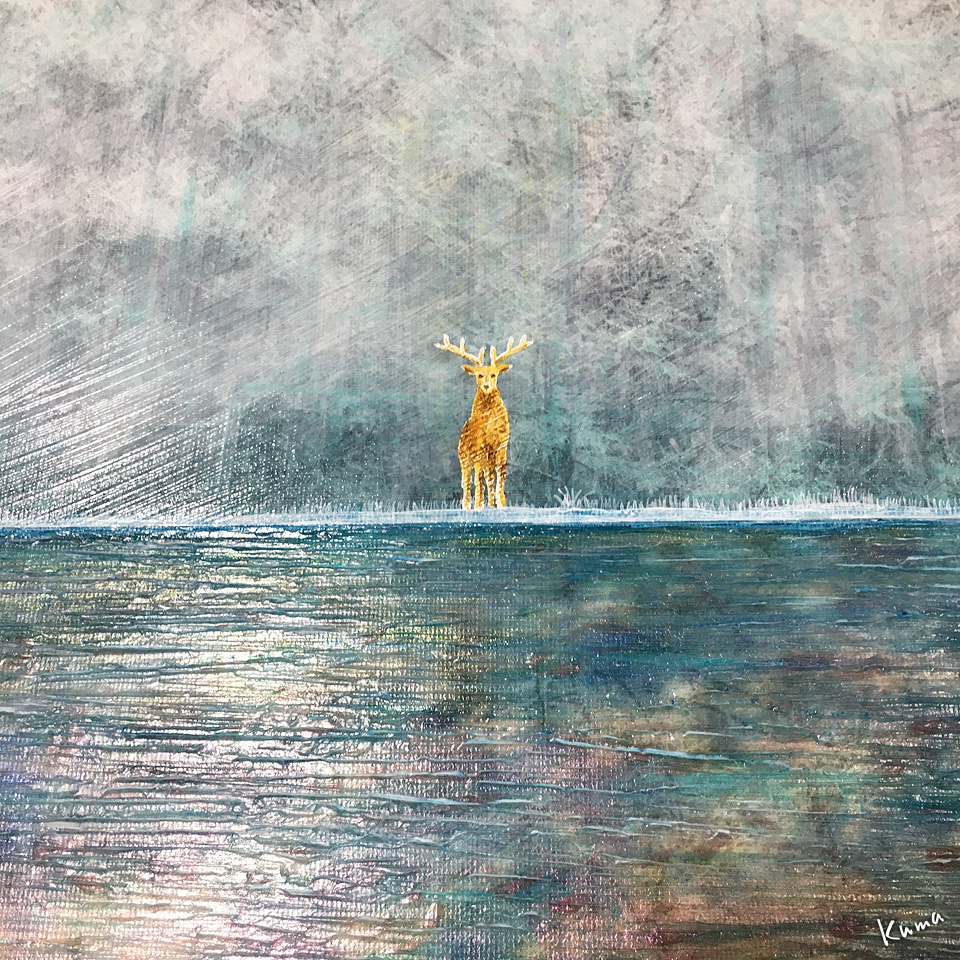 「アトリエ日記 73」の続き。岸辺に牡鹿のシルエットを描いた。