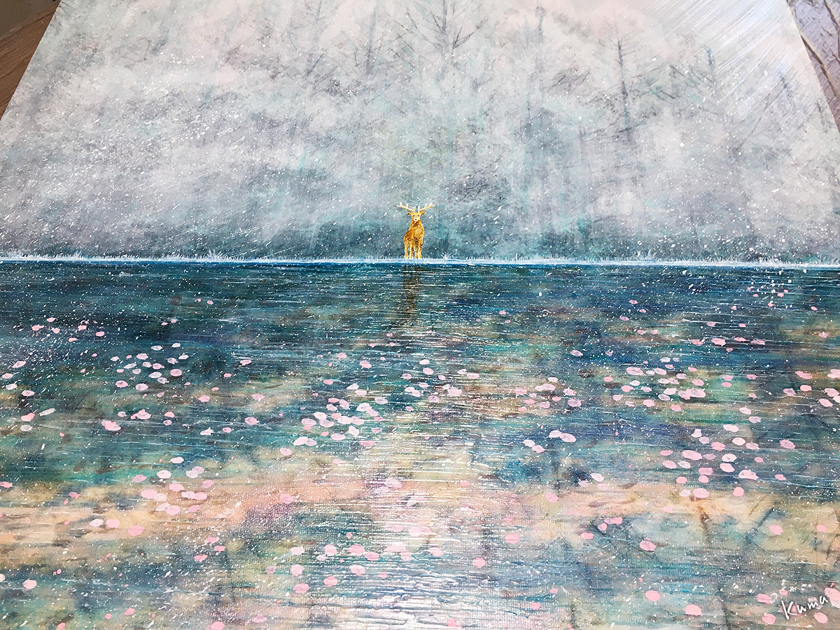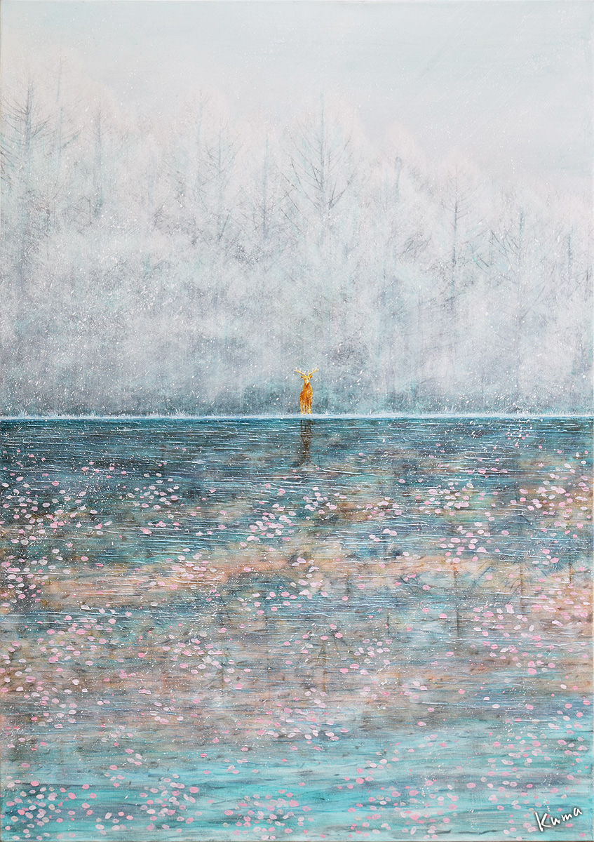 そしてこれも最初からの目論見だが、水面には桜の花びらを舞わせる。岸から上は冬の吹雪、水面は春の桜吹雪というわけだ。