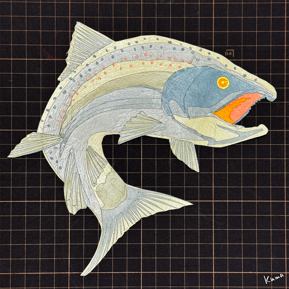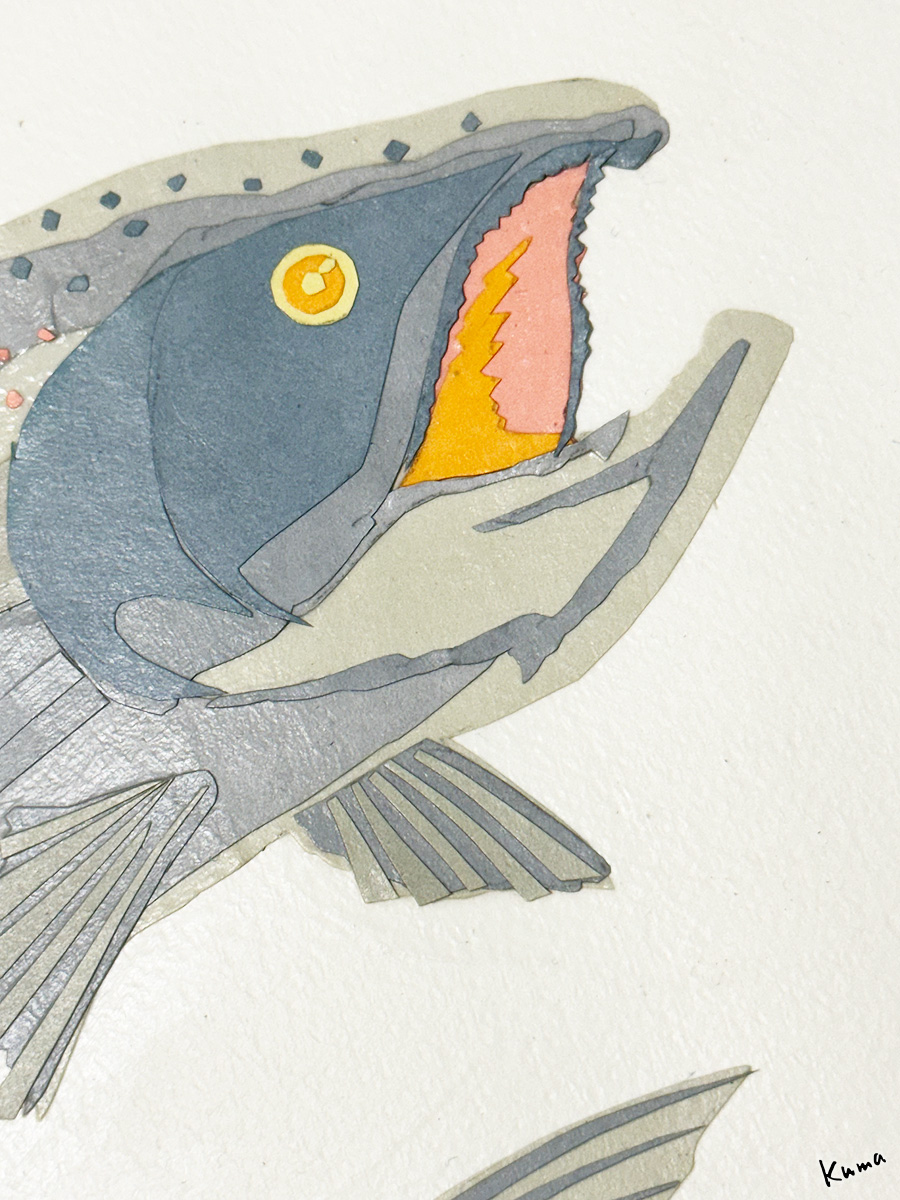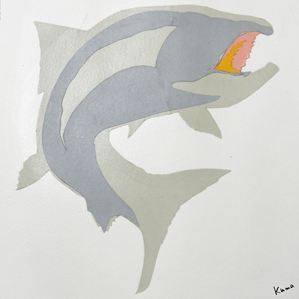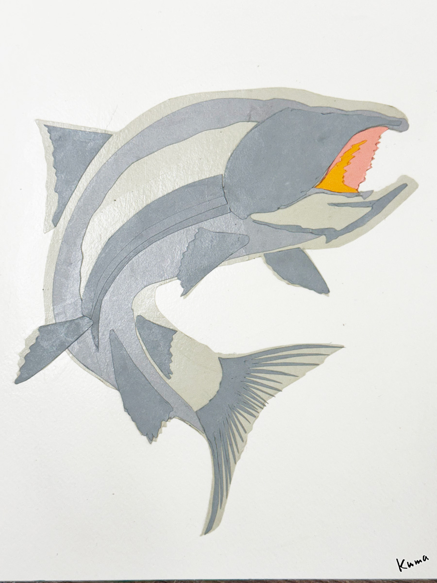 頭部やヒレなどをやや濃い色で貼っていく。ヒレの部分は細かいカットが必要なので時間がかかる。