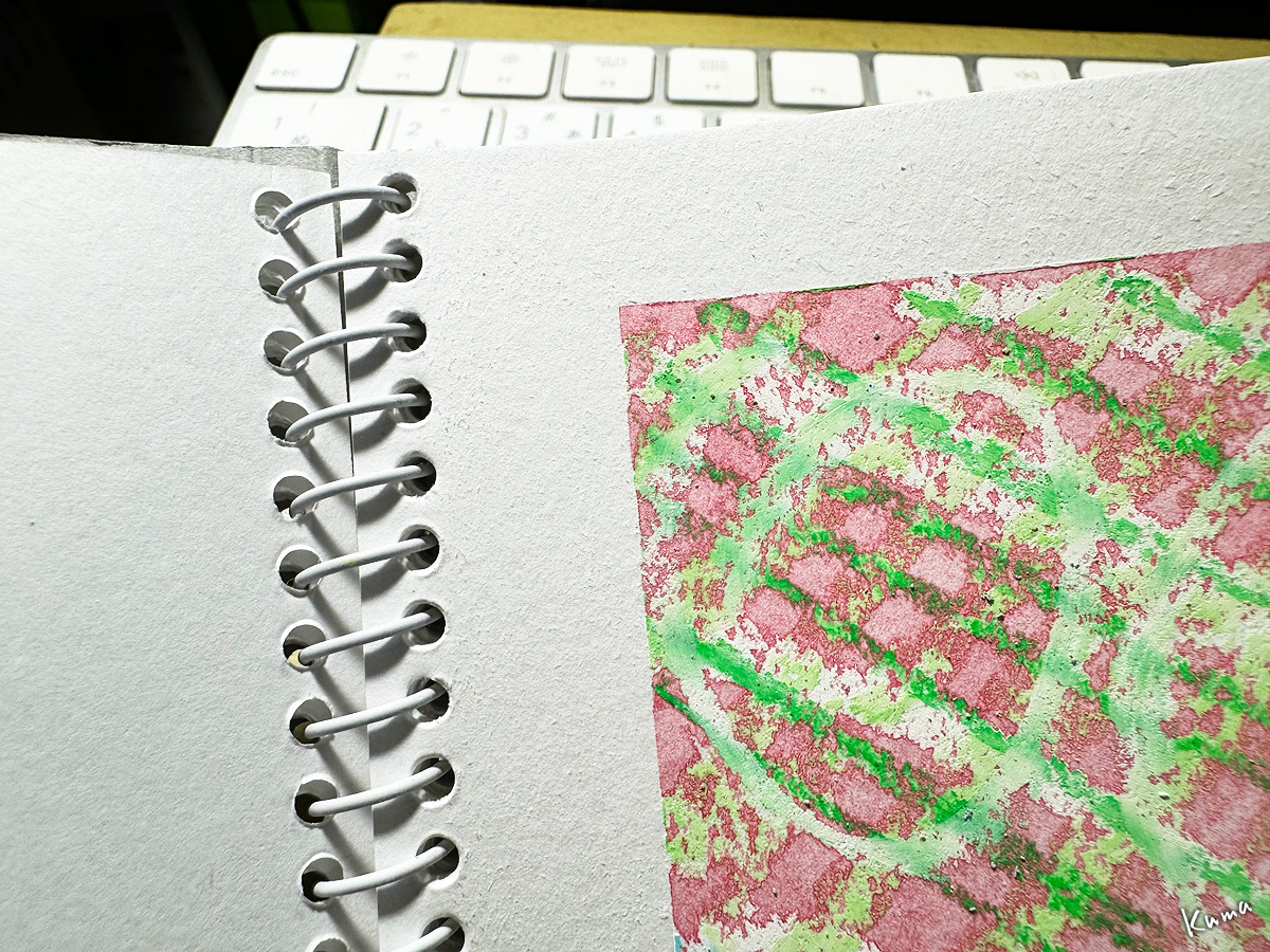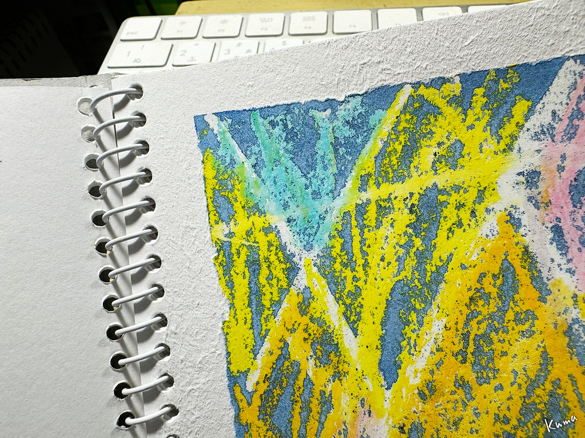 表面強度が高い水彩紙などは大体大丈夫だが、画用紙など表面の弱い紙は難しい。これは剥けてはいないが、表面が毛羽立っている。