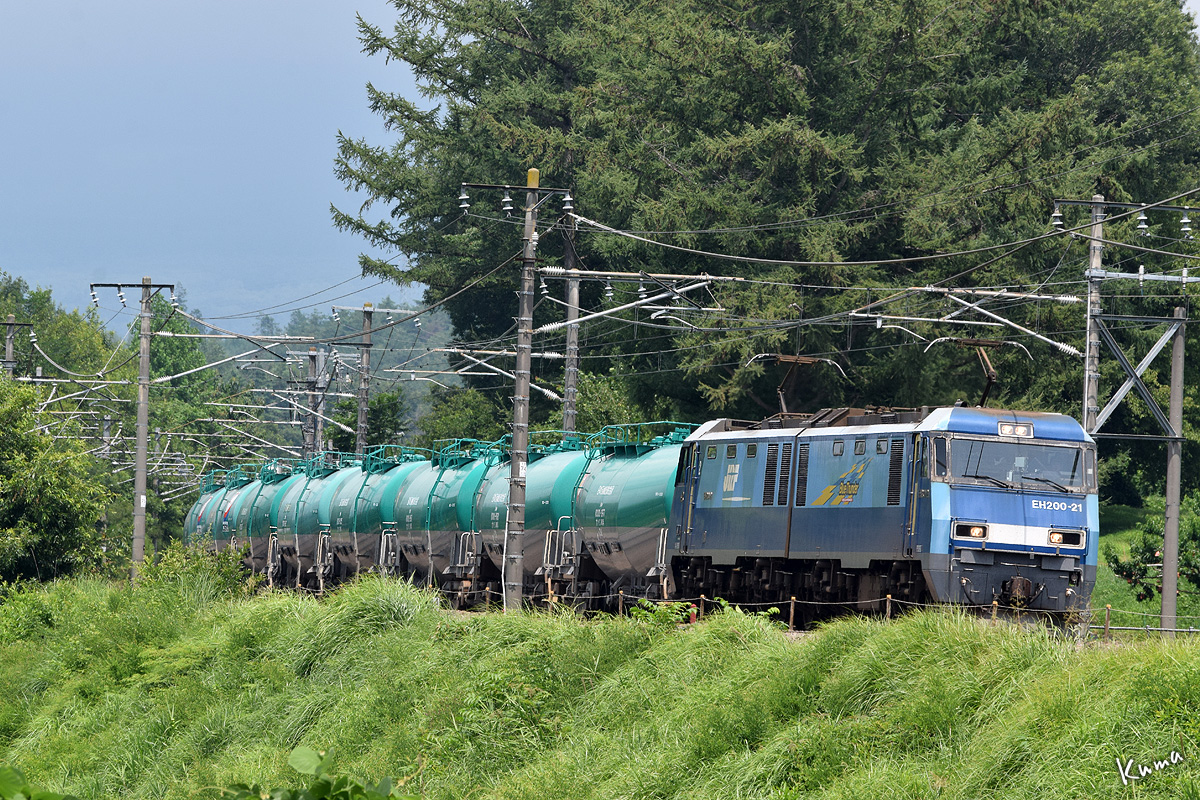 投稿日: 2024年8月25日2024年8月24日 投稿者: くまぱぱ蝉しぐれの中を ブルーツートンの車両が走ってくる。 急に蝉の鳴き声が小さくなったように感じる。 EH200型電気機関車が牽く貨物列車だ。 今日の牽引機は21号。 後に続くのは全てタキ1000型だ。 高速石油専用列車と呼ばれ、タンク車をタキ1000型に統一することで、最高速度95km/hでの走行を可能にしている。 轟音が通り過ぎた跡は、また元通りの蝉しぐれが続いていた。