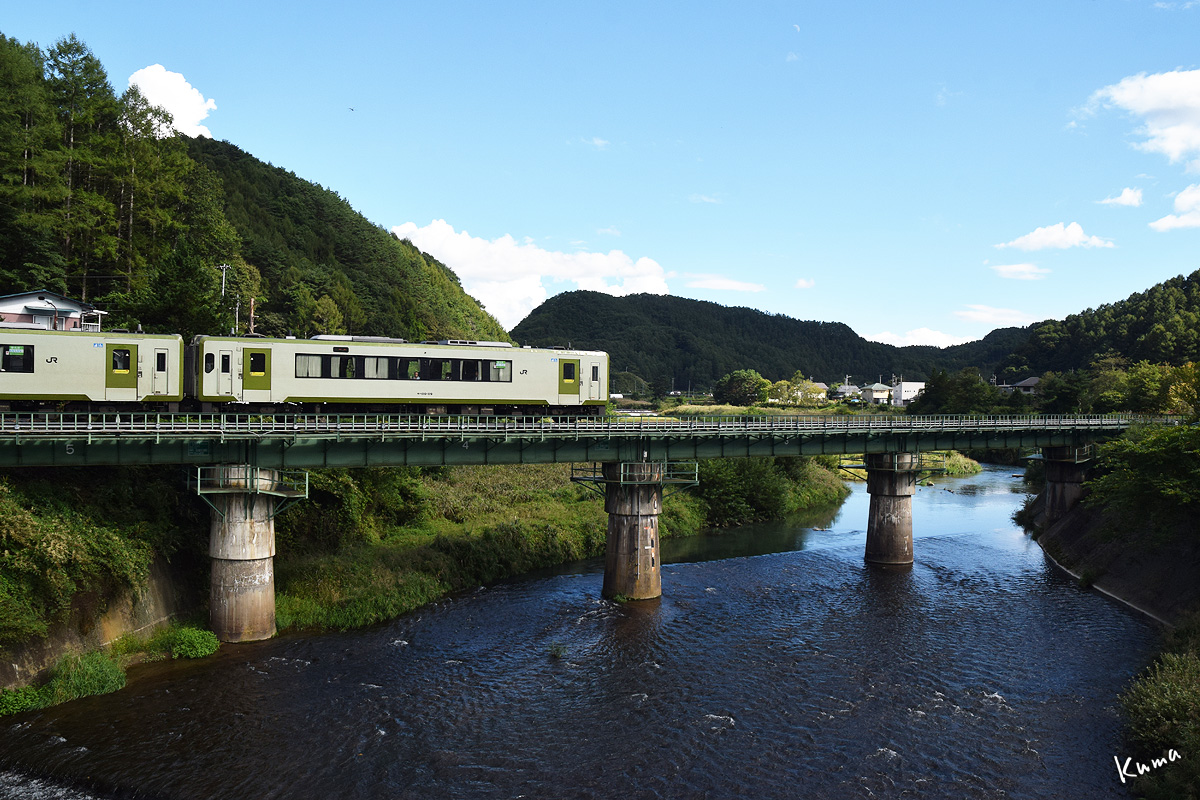 投稿日: 2024年10月20日2024年10月20日 投稿者: くまぱぱ第五千曲川橋梁 千曲川は日本一の長さを誇る信濃川の長野県内での名前だ。 全長367kmの内、信濃川と呼ばれている部分153km、千曲川と呼ばれている部分は214 kmと、千曲川が長いのだが・・ 法的には信濃川となる。しかし地元に強く認知されている河川名「千曲川」も地域での名称として表示されている。 ここは小海線海尻駅手前の第五千曲川橋梁(橋長85m)。千曲川は長いので上流部と言って良いだろう。 ここは水深が浅く瀬になっているが、大雨などで増水すると橋脚の半ばくらいに水面が上がることもある。