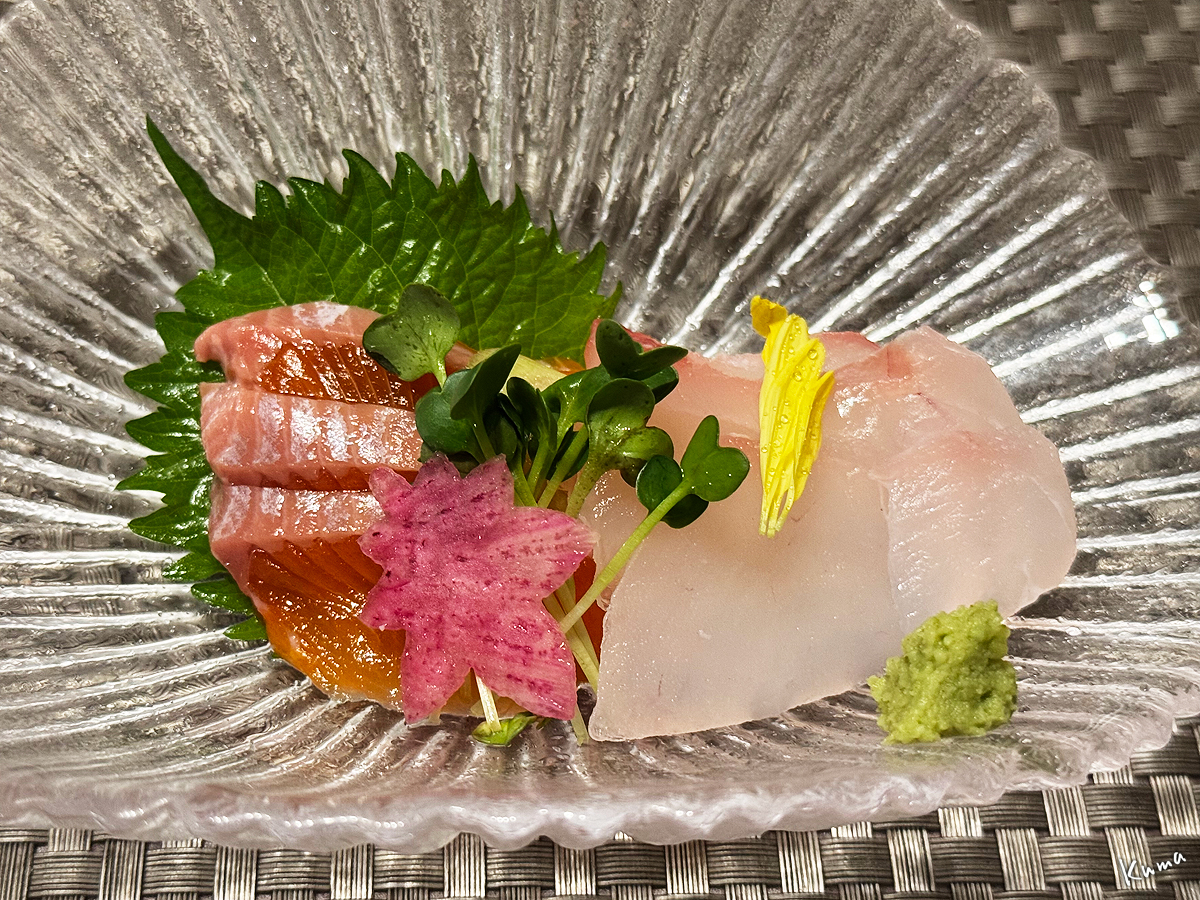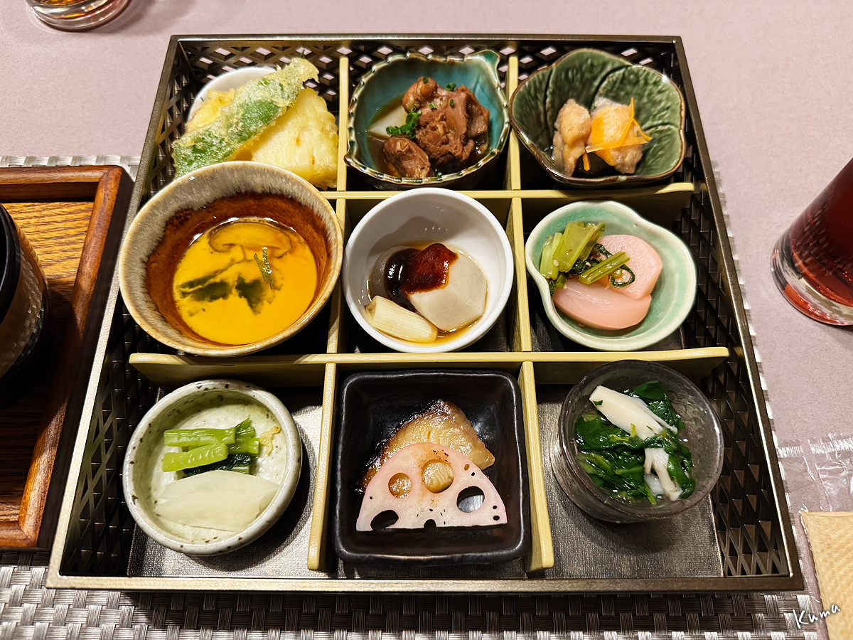 メインの季節の小鉢9品。右上から天ぷら三種、鶏黒酢煮、鱒のマリネ、湯豆腐、里芋蒟蒻田楽、かぶ紅梅煮、漬物、銀鱈味噌漬け、春菊お浸し。