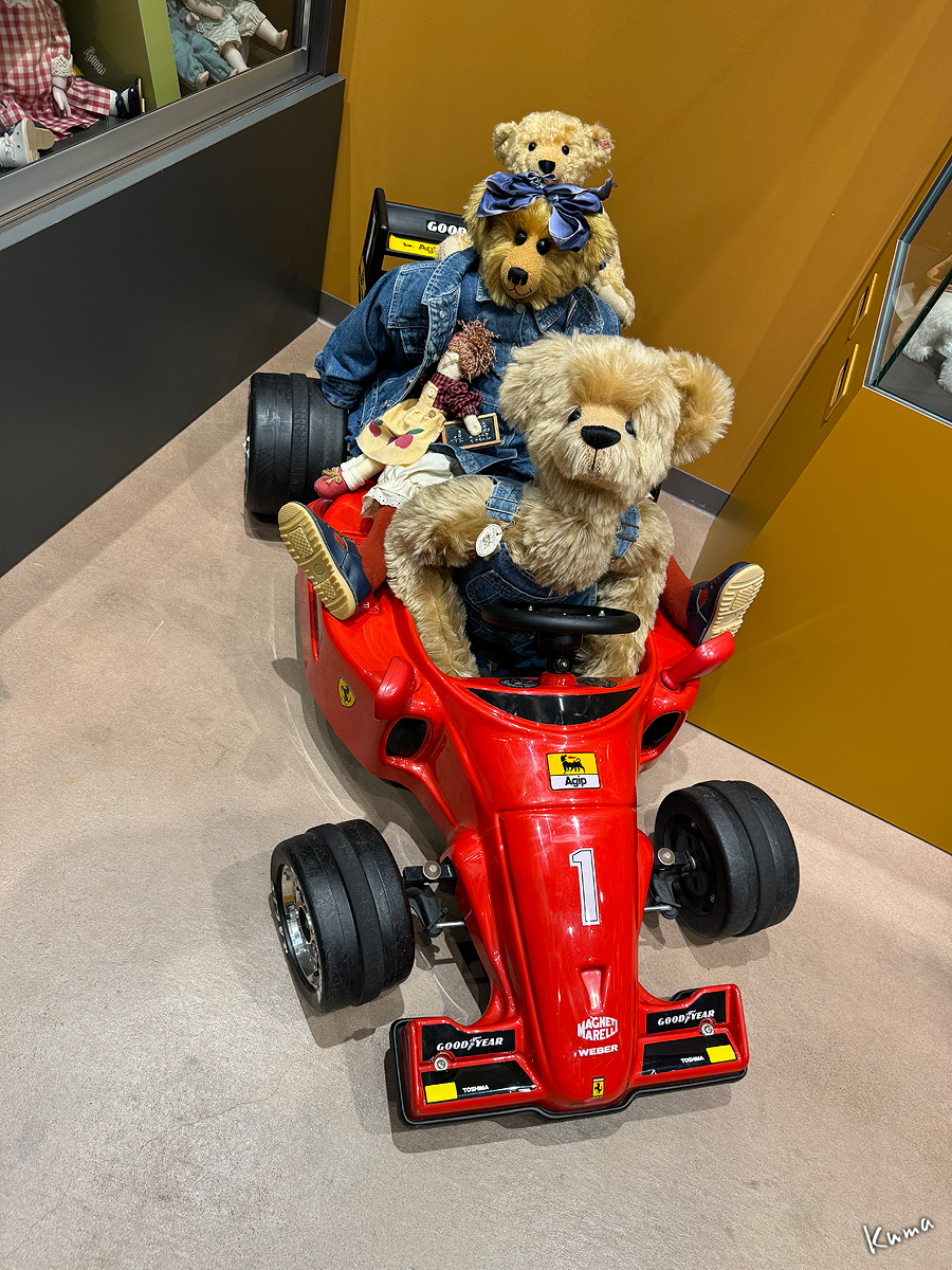 後ろにあるショーケースにはテディベア以外のビスクドールなどの人形も満杯状態。特に大きなものや謂われのあるものはこんな展示も。