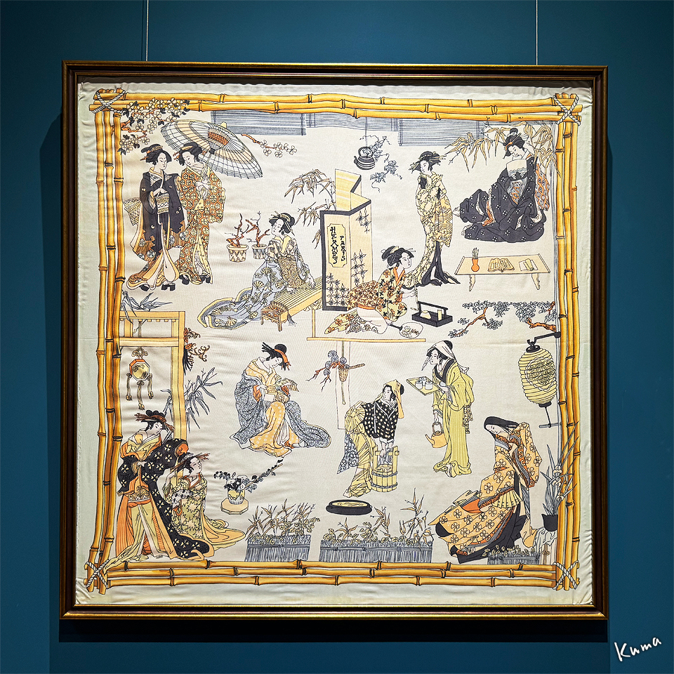 これも古いもので、ジャポニズムブームのフランスで大人気だったとか。中央上の屏風に、縦書きのローマ字で「HERMES PARIS」と入っている。