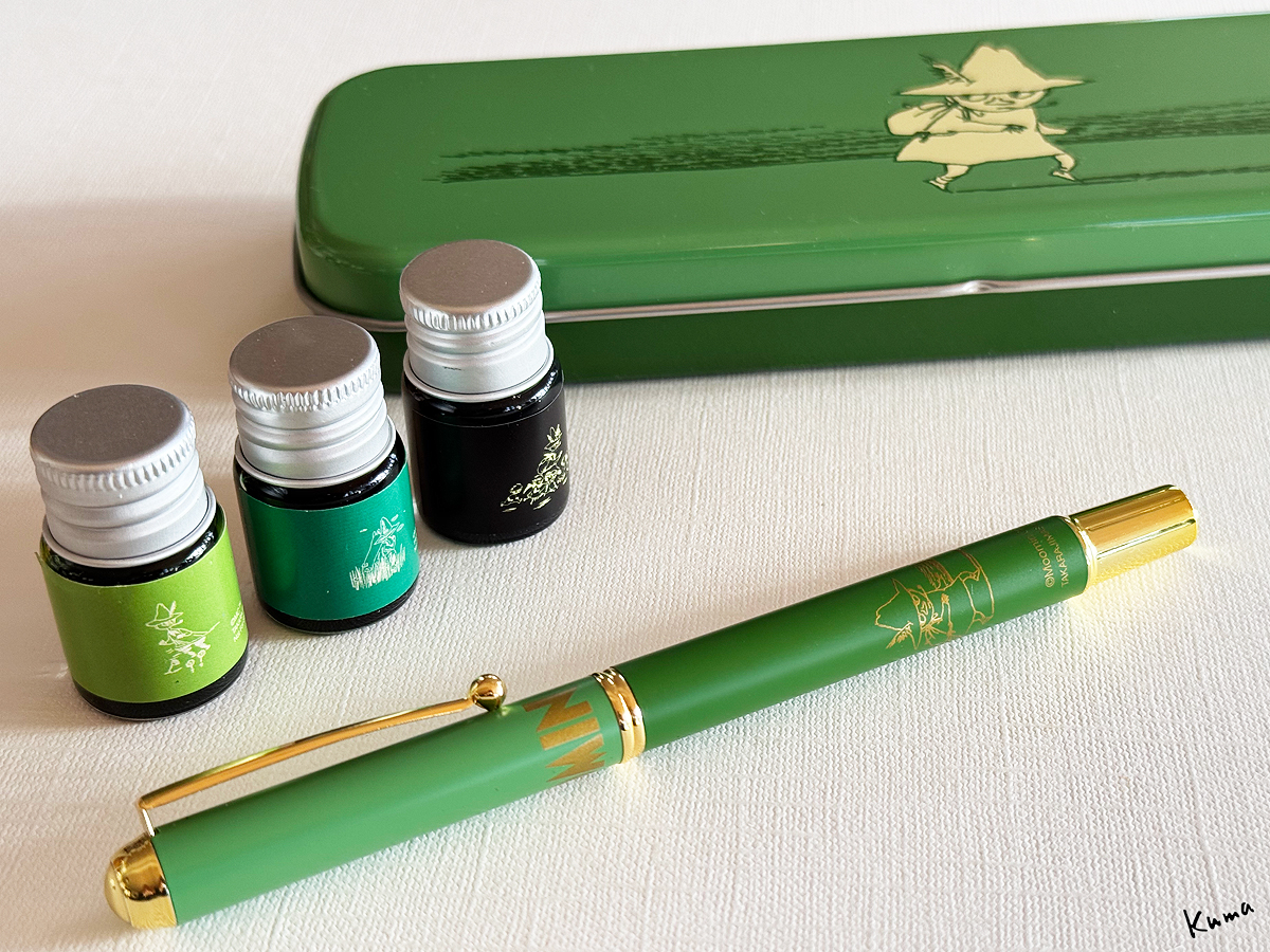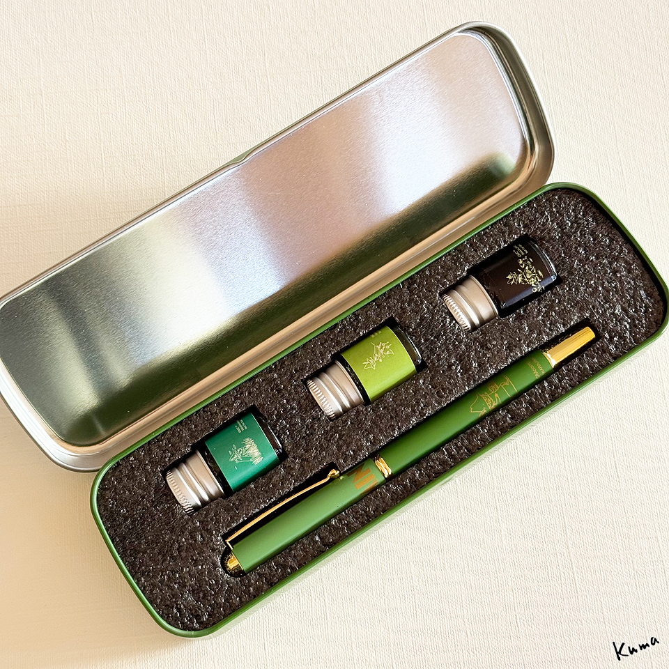 こんな感じで、万年筆風の筆ペンとインクが3色入っている。