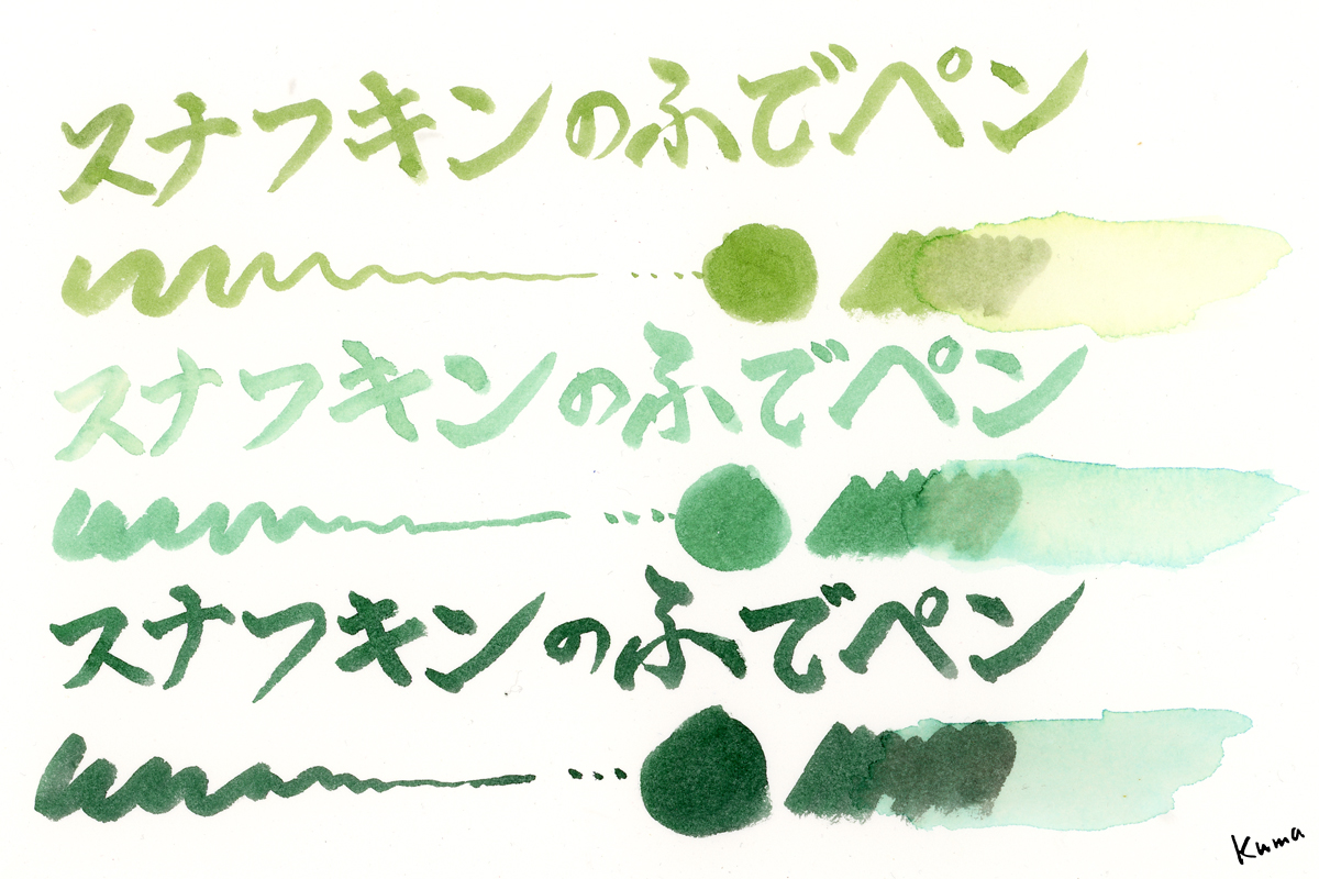 二番目は深緑だが、薄緑のインクを水洗いしたときの水分が中に残っていて、ちょっと薄くなってしまった。