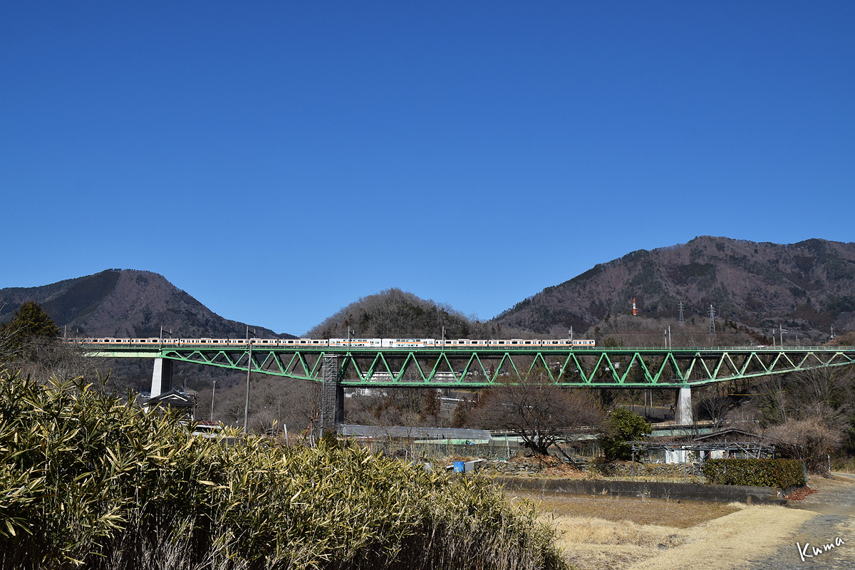 投稿日: 2025年2月21日2025年2月20日 投稿者: くまぱぱ新桂川橋梁 中央線快速が桂川を渡る。 新桂川橋梁は全長513mだ。 車両はE233系の12両編成。 8両目と9両目がグリーン車だ。 大月駅まではこういう車両も入ってくる。