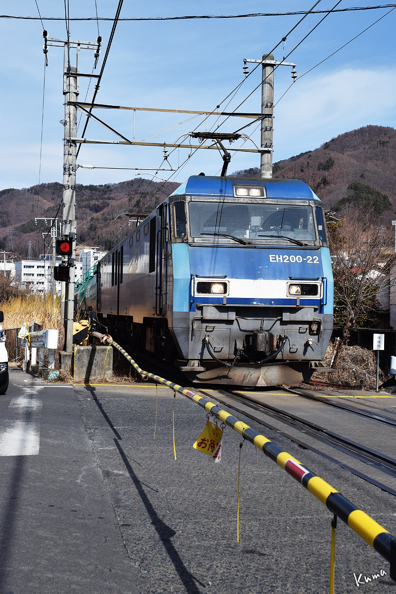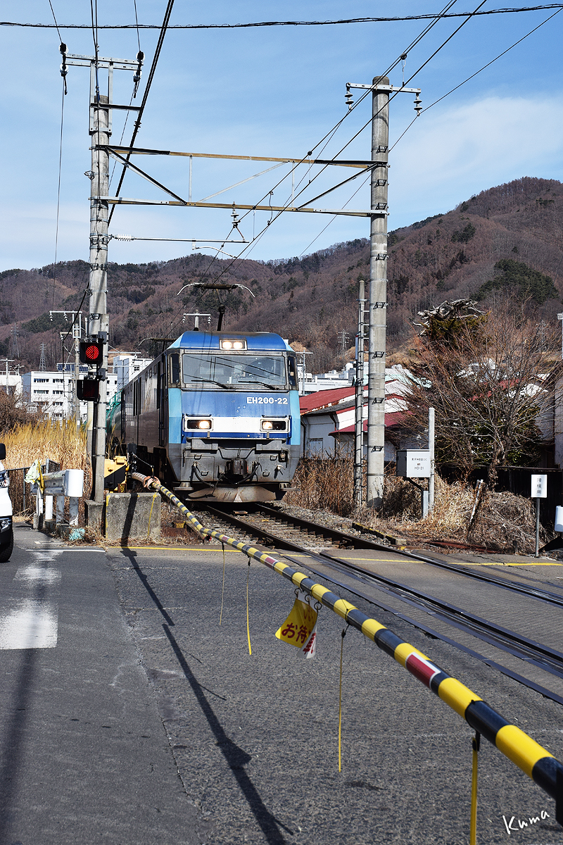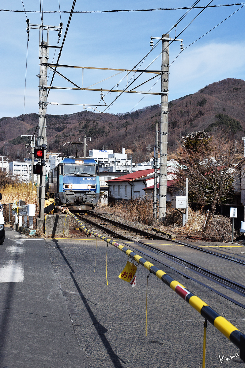 投稿日: 2025年3月3日2025年3月2日 投稿者: くまぱぱ第3甲州街道踏切 中央線と国道20号が交差する踏切。 上諏訪付近の単線区間をEH200が走ってくる。 上りの高速石油列車だ。 空返(くうへん=空車返送)なので走行音は軽い。 第3甲州街道踏切と言えば、小海線の最高地点の踏切と同じ名称だ。 小海線の方は国道114号(佐久甲州街道)との交差なので「佐久甲州街道踏切」とするのが正しいかも知れないが、小海線には国道20号(甲州街道)との交差はないから、同じ路線内で混乱することはないので「佐久」を省略して「甲州街道踏切」にしたのだろう。 全国何処に行っても同名のない駅名と違って、踏切の場合は路線が違えば同じ名前も使われている。