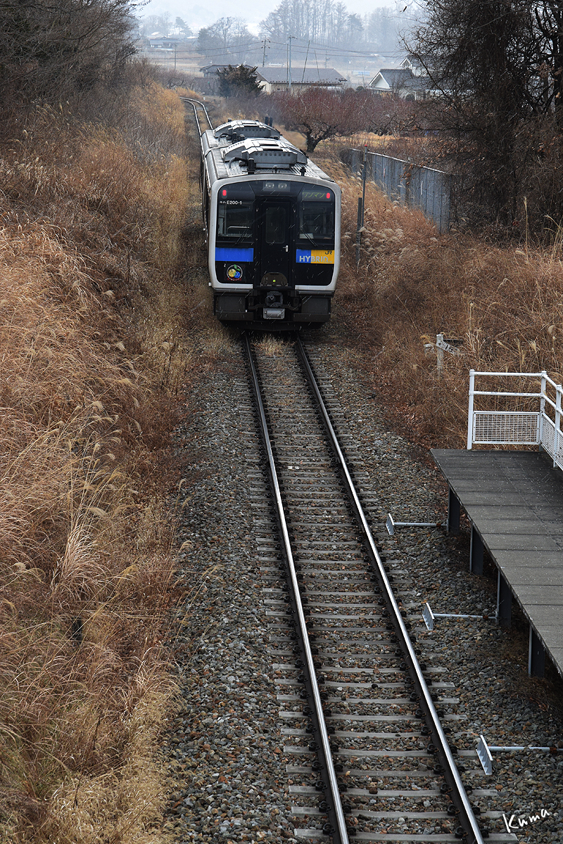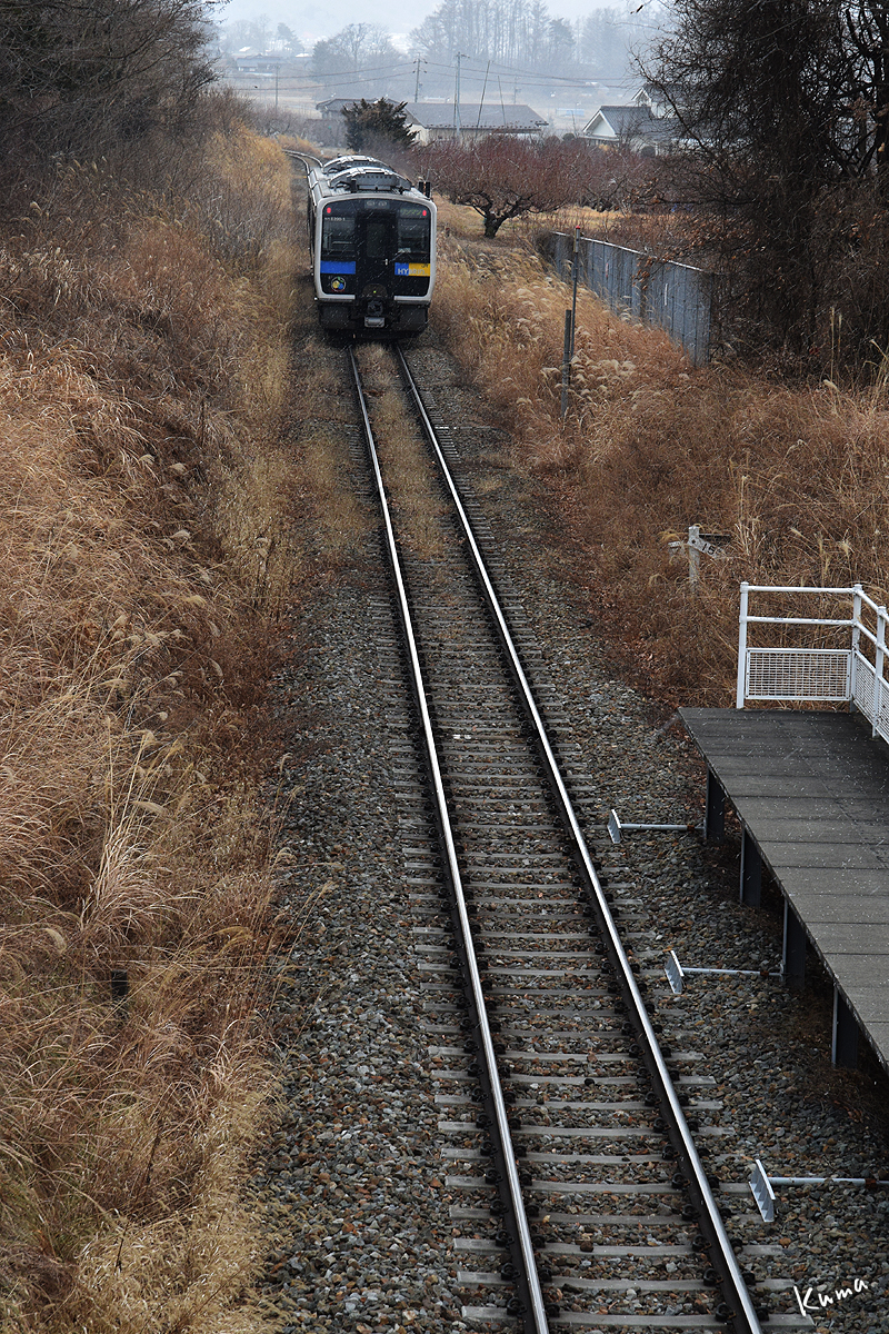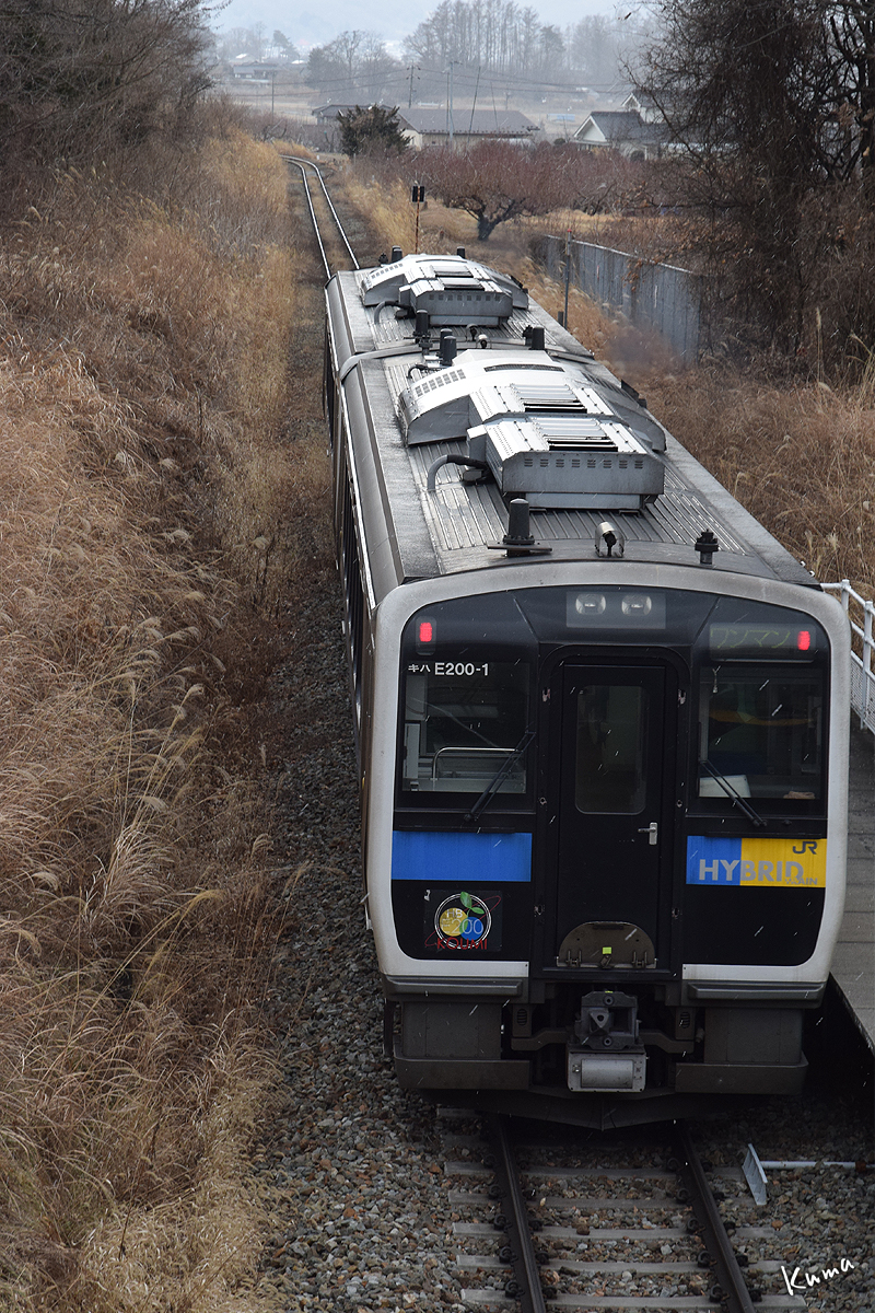 投稿日: 2025年3月17日2025年3月16日 投稿者: くまぱぱ走り去るハイブリッド列車 美里駅を出ていく上り普通列車だ。 駅のホームをまたぐ一般道の陸橋からの撮影。 寒い日で小雪がチラチラと舞っている。 キハE200は端面が黒いので雪の粒がよく見える。 雪が少し多くなって、あっという間に遠景が白っぽく霞んできた。