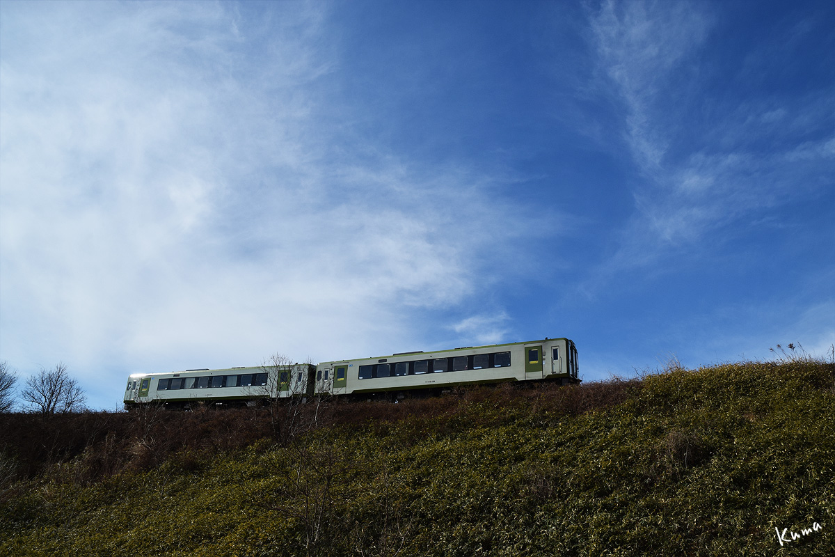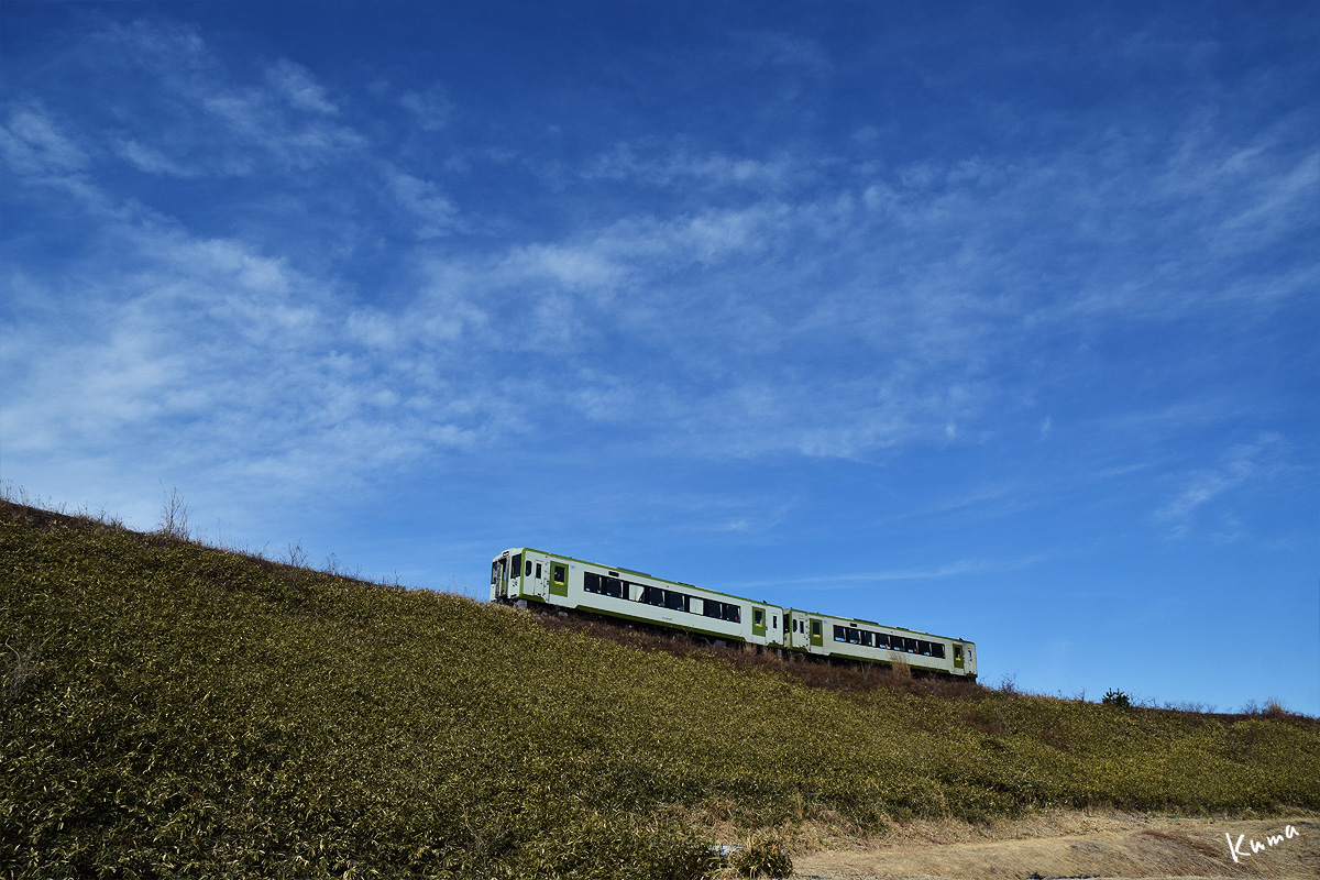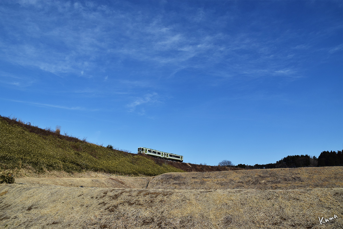 投稿日: 2025年3月28日2025年3月27日 投稿者: くまぱぱ小海線の大曲り 八ヶ岳の裾野に広がる田園地帯。 300Rの急カーブを2両編成の列車が走ってくる。 低い場所から撮っているので上り坂のように見える。 しかしここは1,000分の25という急な下り勾配だ。 西向きに走ってきた列車が、ぐるりと東に向きを変える。 まもなく小淵沢駅に到着だ。