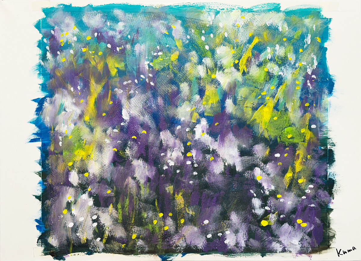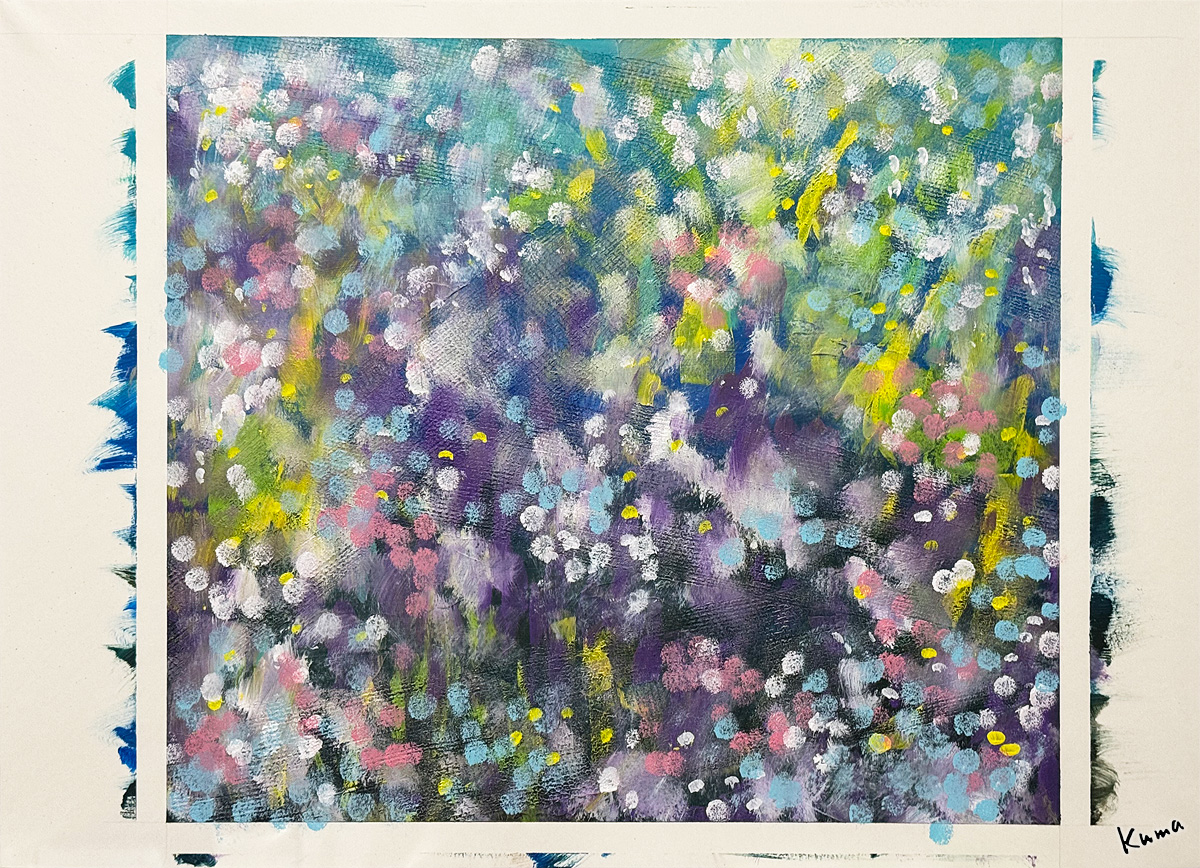 イエロー、ライトグリーン、パープル、ホワイトで全体に色の変化をつけていく。花の咲き乱れる感じを出したい。