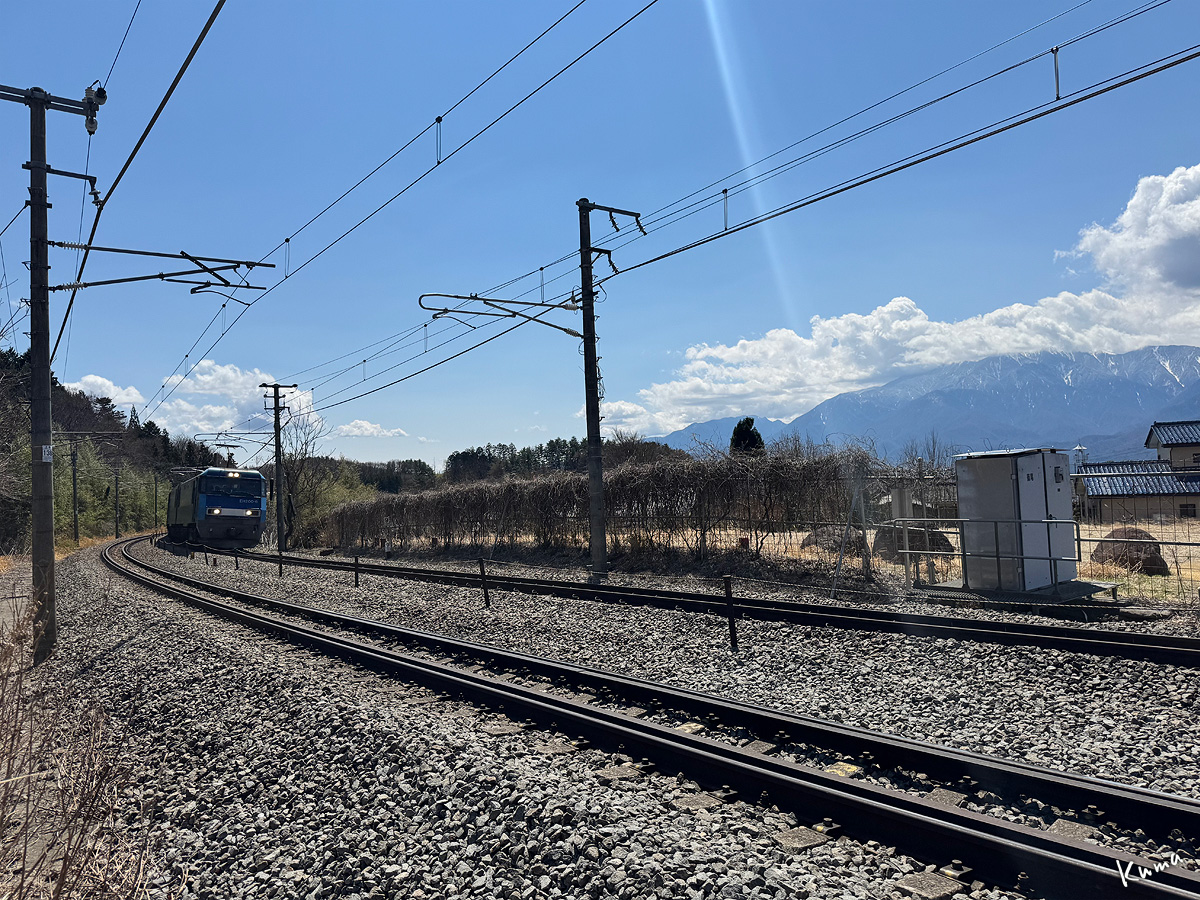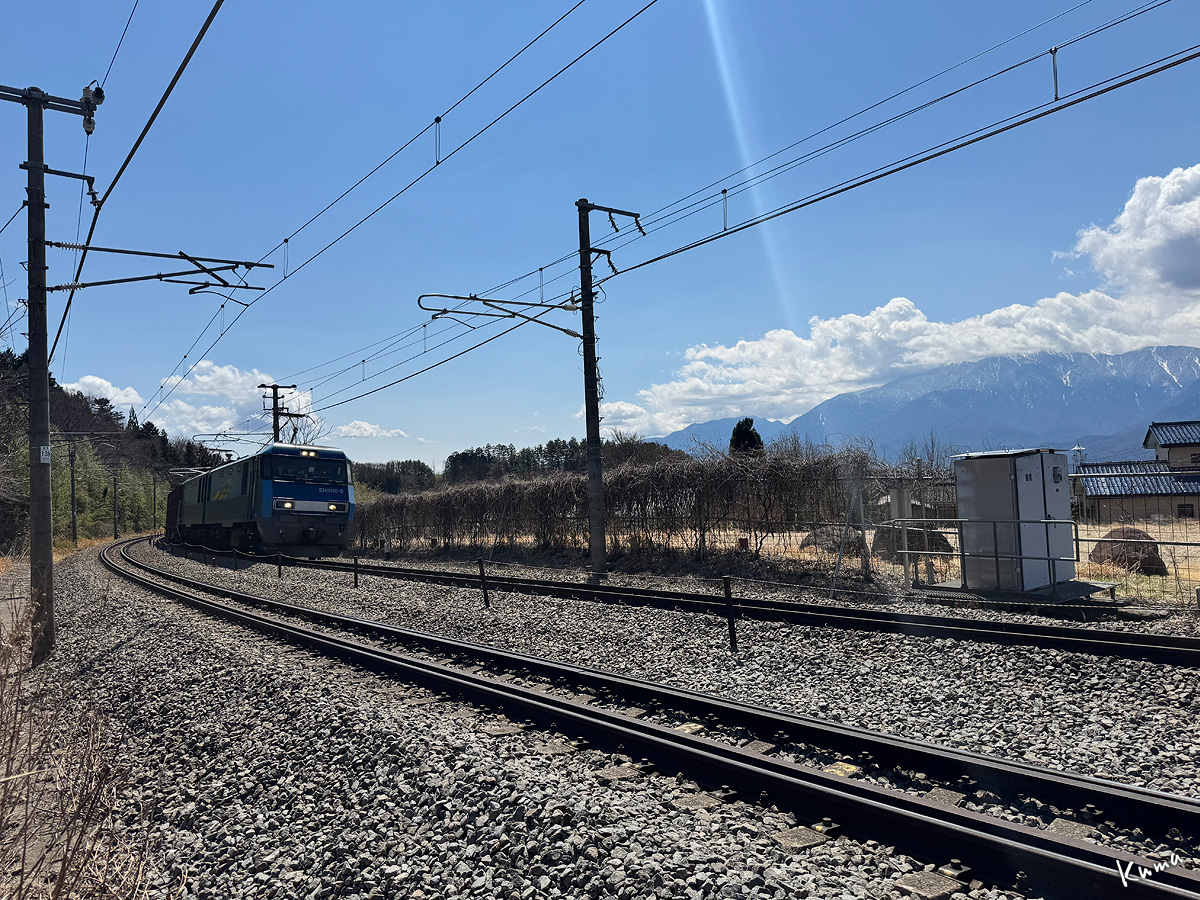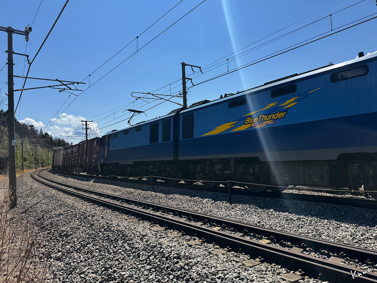 投稿日: 2025年4月11日2025年4月10日 投稿者: くまぱぱ疾走 電気機関車EH200が走ってくる。 貨物列車と言っても馬鹿にできない速さだ。 特急電車と比べれば重い分だけ不利ではある。 しかし国鉄時代には考えられなかった速度だ。 ブルーの車体にBlueThunderの黄色いロゴが駆け抜けていく。