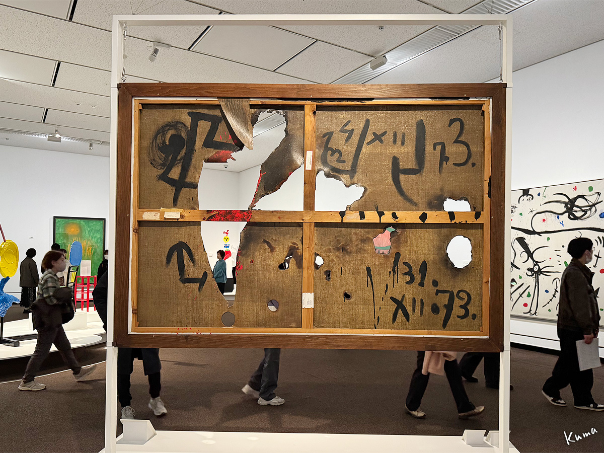 その裏側。白いカンヴァスに絵の具を垂らし、踏みつけ、切り裂き、火をつけたと言う。