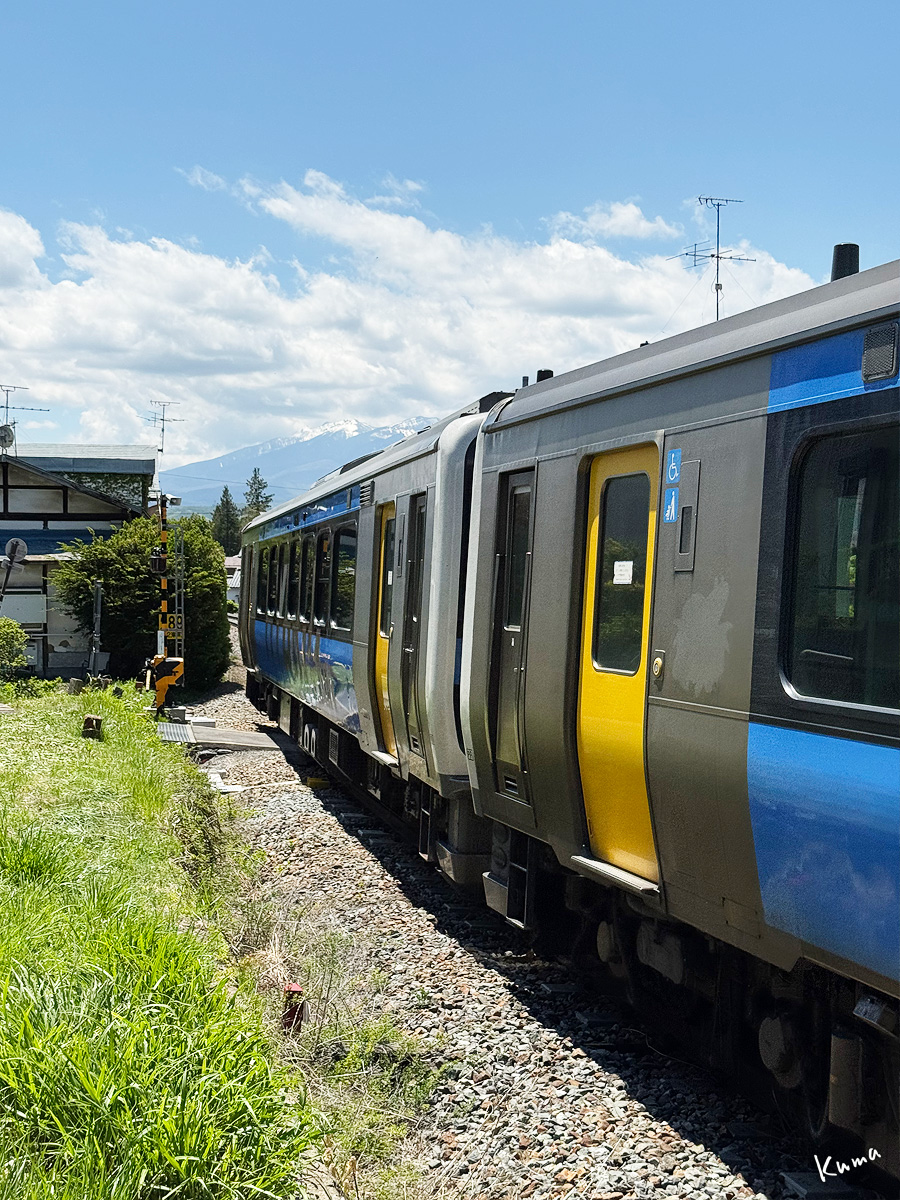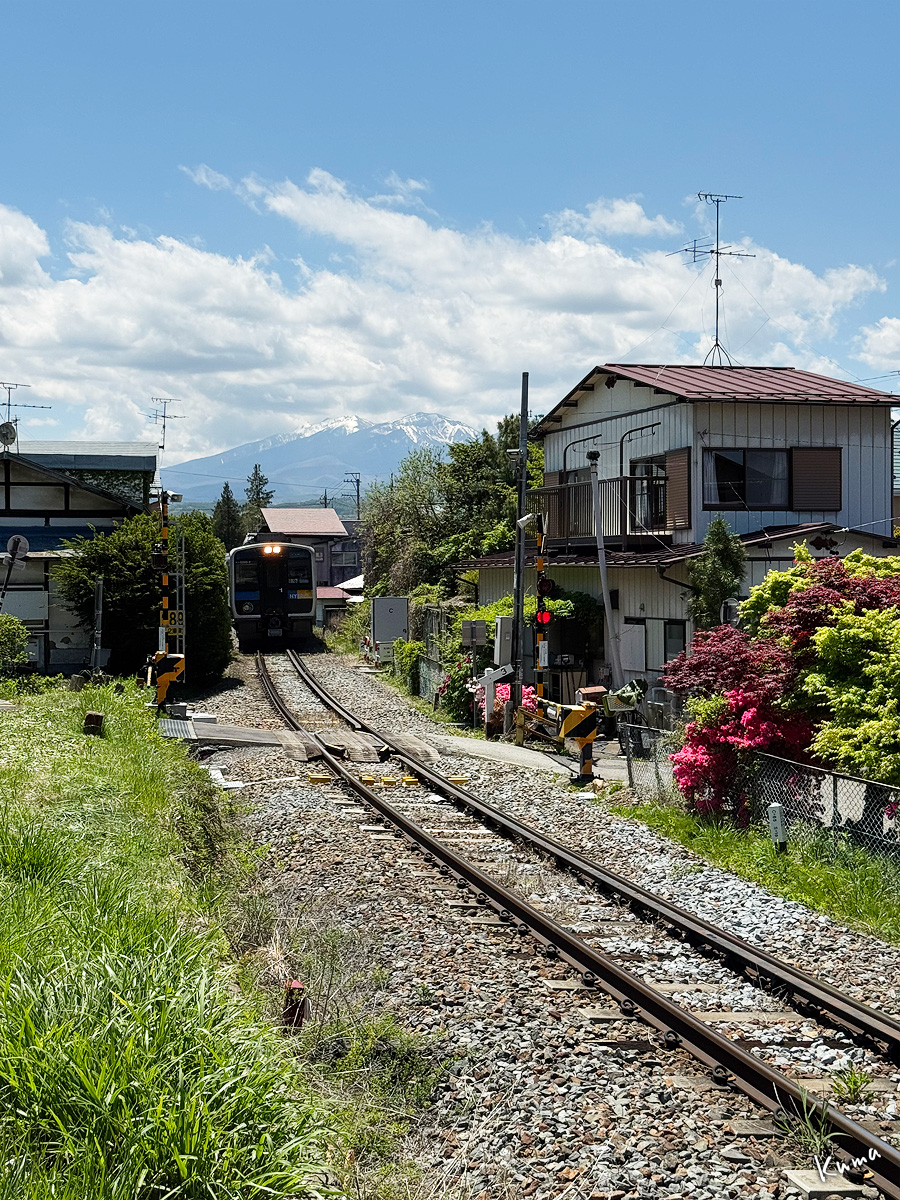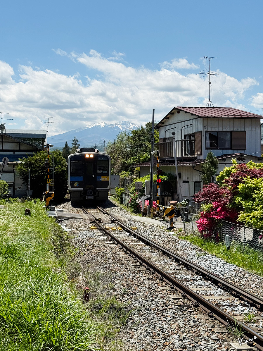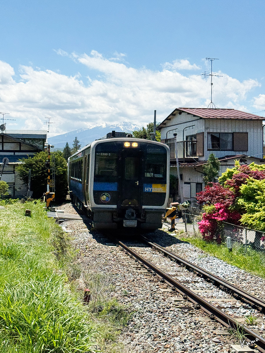 投稿日: 2025年5月19日2025年5月18日 投稿者: くまぱぱ羽黒下付近を走る 家々の立ち並ぶ集落の中。 小海線の列車が走ってくる。 キハE200形、ハイブリッド列車だ。 ここは背後に八ヶ岳が望める。 家と家の間を縫うように線路がある。 勾配が緩やかで、轍の音も軽やかだ。