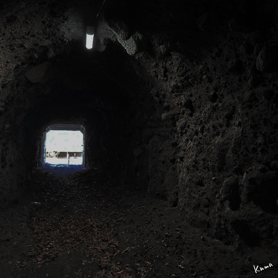 絶壁の下にご覧のような手掘りの参道がある。距離は短いし、照明のある時間帯なら何の問題もなく歩いて行ける。