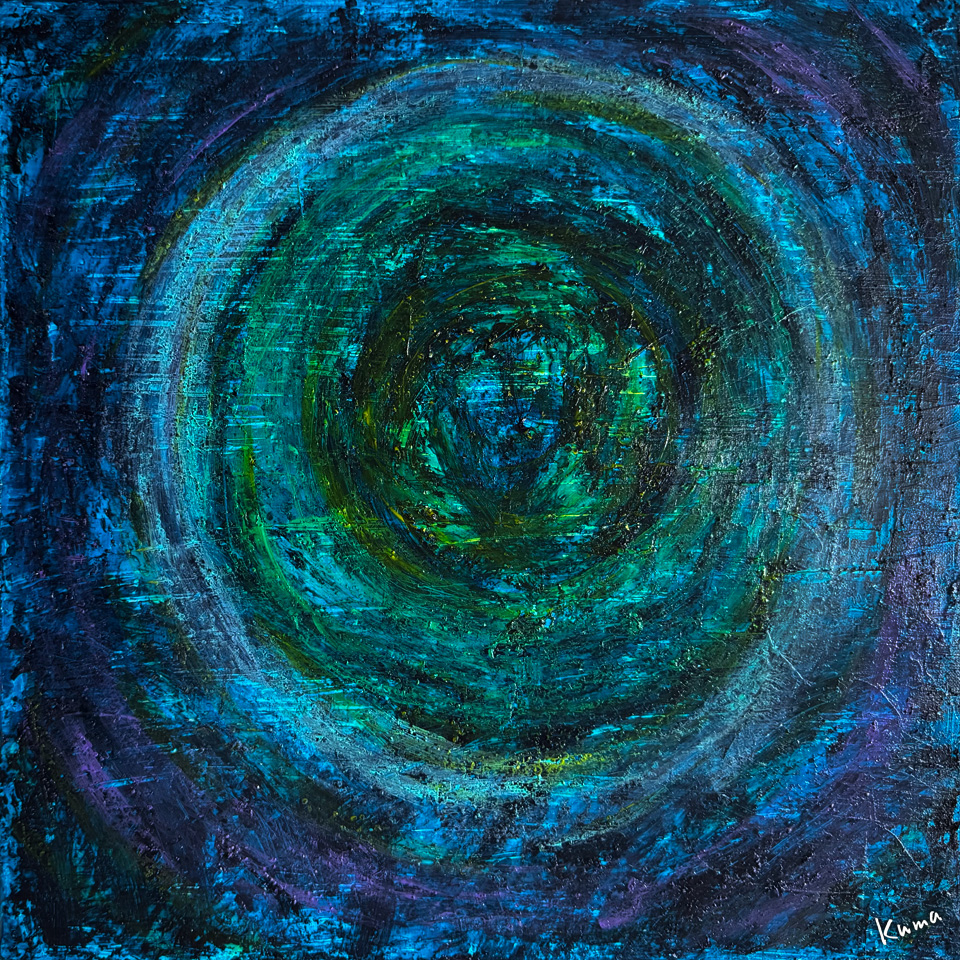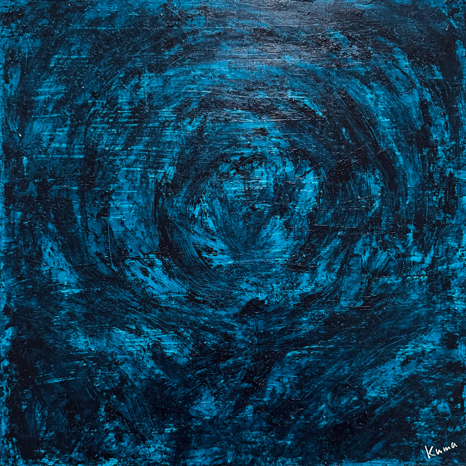 完全に乾燥させてから暗い青を塗り重ねる。豚毛の硬いブラシを使って荒々しい渦巻きのようにしてみた。