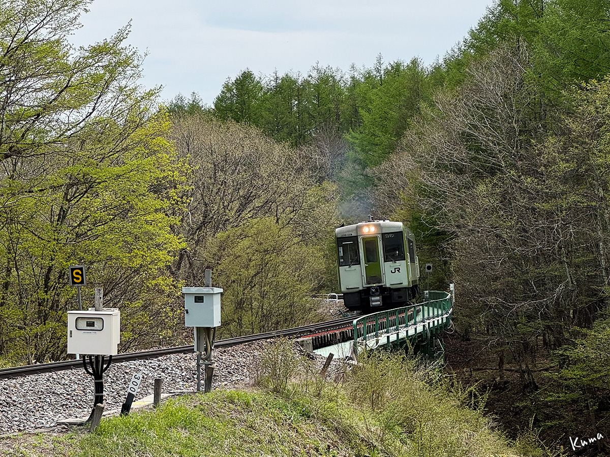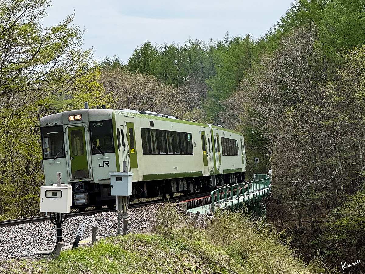 投稿日: 2025年6月30日2025年6月29日 投稿者: くまぱぱ森の中の鉄橋 小海線の列車が顔を出した。 カーブした小さな鉄橋に差し掛かる。 ヘッドライトがこちらを向いて一瞬光りが強くなった。 キハ110の2両編成だ。 ここの上り勾配は22パーミル。 エンジン音にもスピードにも余裕が感じられる。