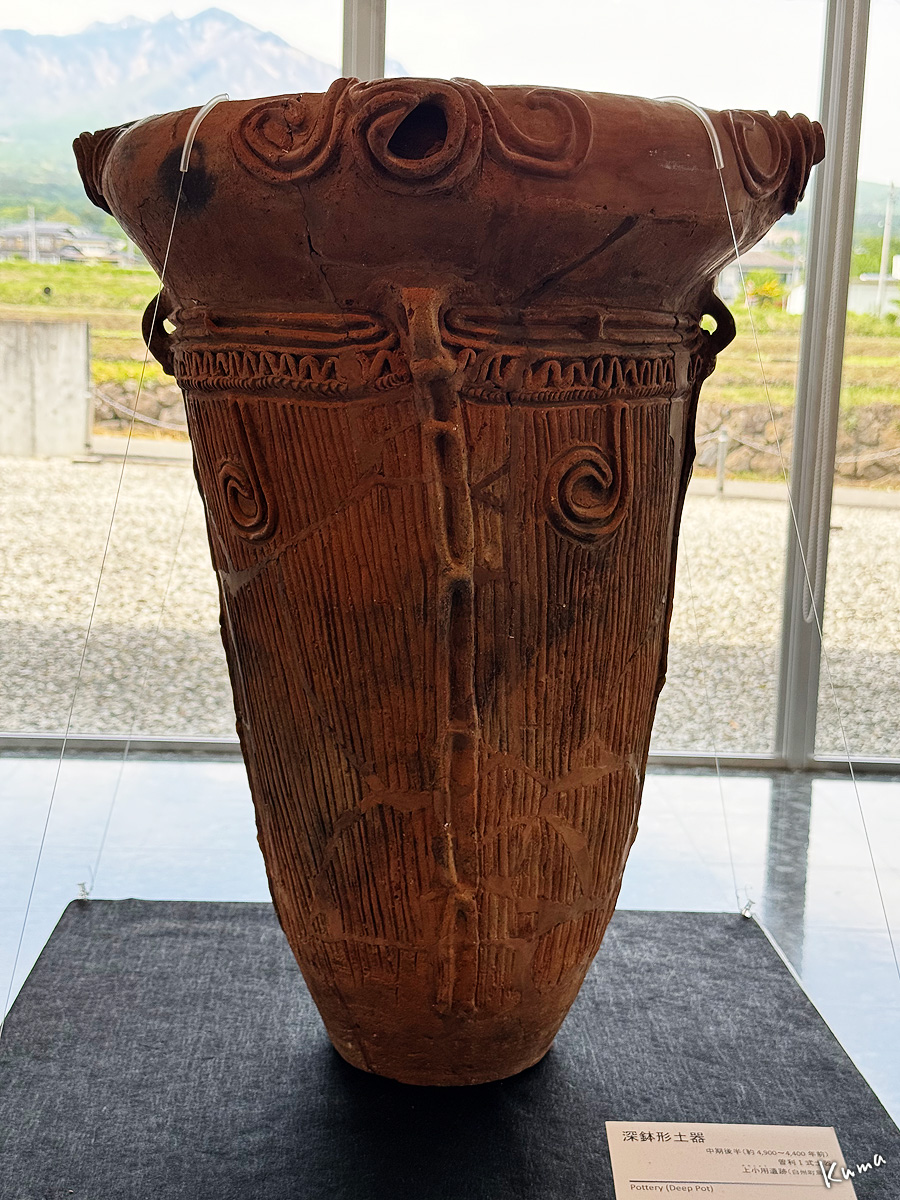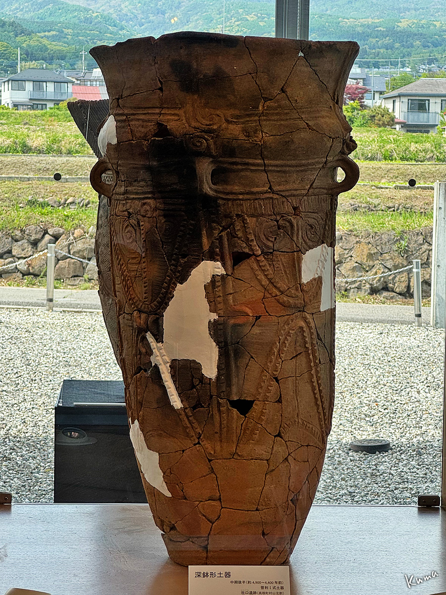 深鉢形土器。ちょっと歪んでいるが、細身で背の高い土器。欠損部の白漆喰の形が「ゴジラ」に見えるのは私だけ・・?