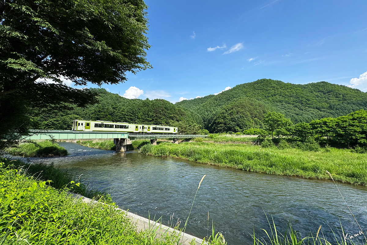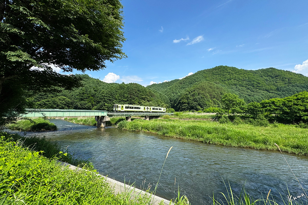 投稿日: 2025年7月18日2025年7月18日 投稿者: くまぱぱ第4千曲川橋梁 佐久海ノ口駅手前の鉄橋だ。 キハ110、2両編成の下り列車がわたり始めた。 デッキガーダーとスルーガーダーが組み合わされた鉄橋だ。 橋の全長は107m。小海線で2番目に長い。 国道141脇の神社の境内から撮影できる。