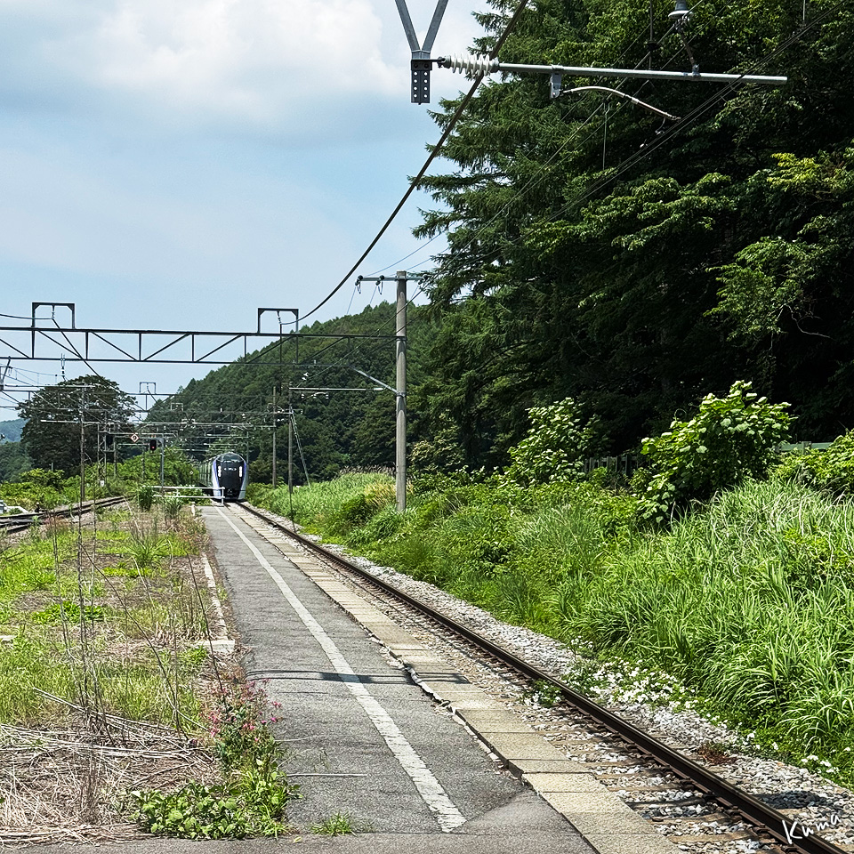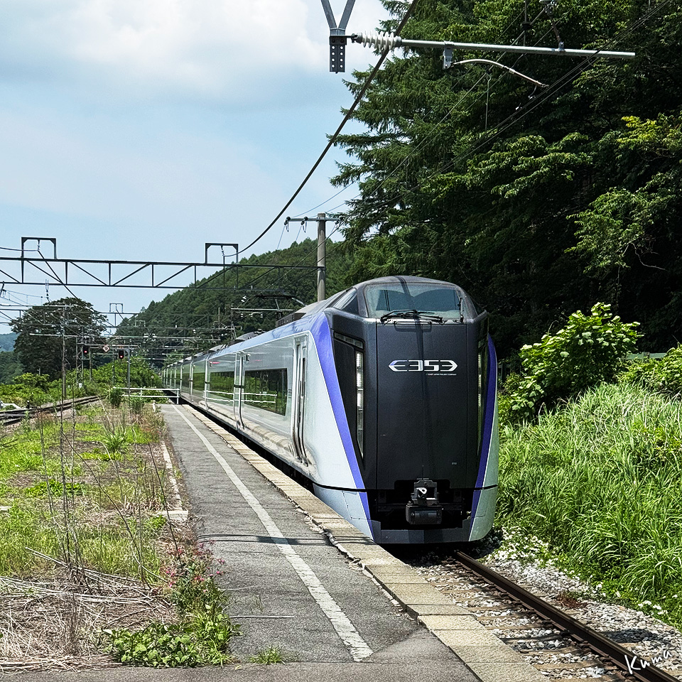 投稿日: 2025年7月21日2025年7月20日 投稿者: くまぱぱ上りあずさの青柳駅進入 E353系の特徴的なヘッドライトが光る。 特急あずさが青柳駅上り本線に入ってくる。 ちょうどホーム端のところでメロディー本を鳴らした。 本線通過なので速度はほとんど落としていない。 あっという間に横を通過していく。 普通列車の時刻には早いのでホームに乗客は一人も居ない。