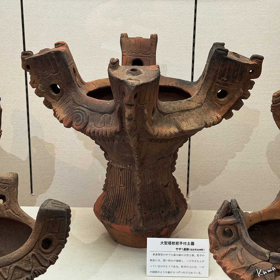 これは大型塔状把手付土器。西洋の城塞都市の塔のような形の把手だが、前側に蛇が立ち上がったような姿がある。
