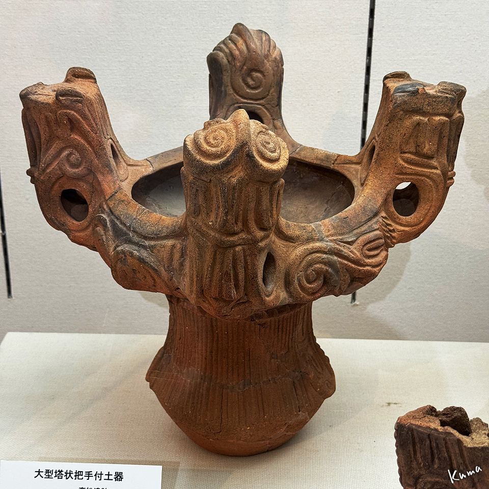 これも大型塔状把手付土器だが、頂部が平面のものと丸いものの2種類がある。水煙文のような文様もある。