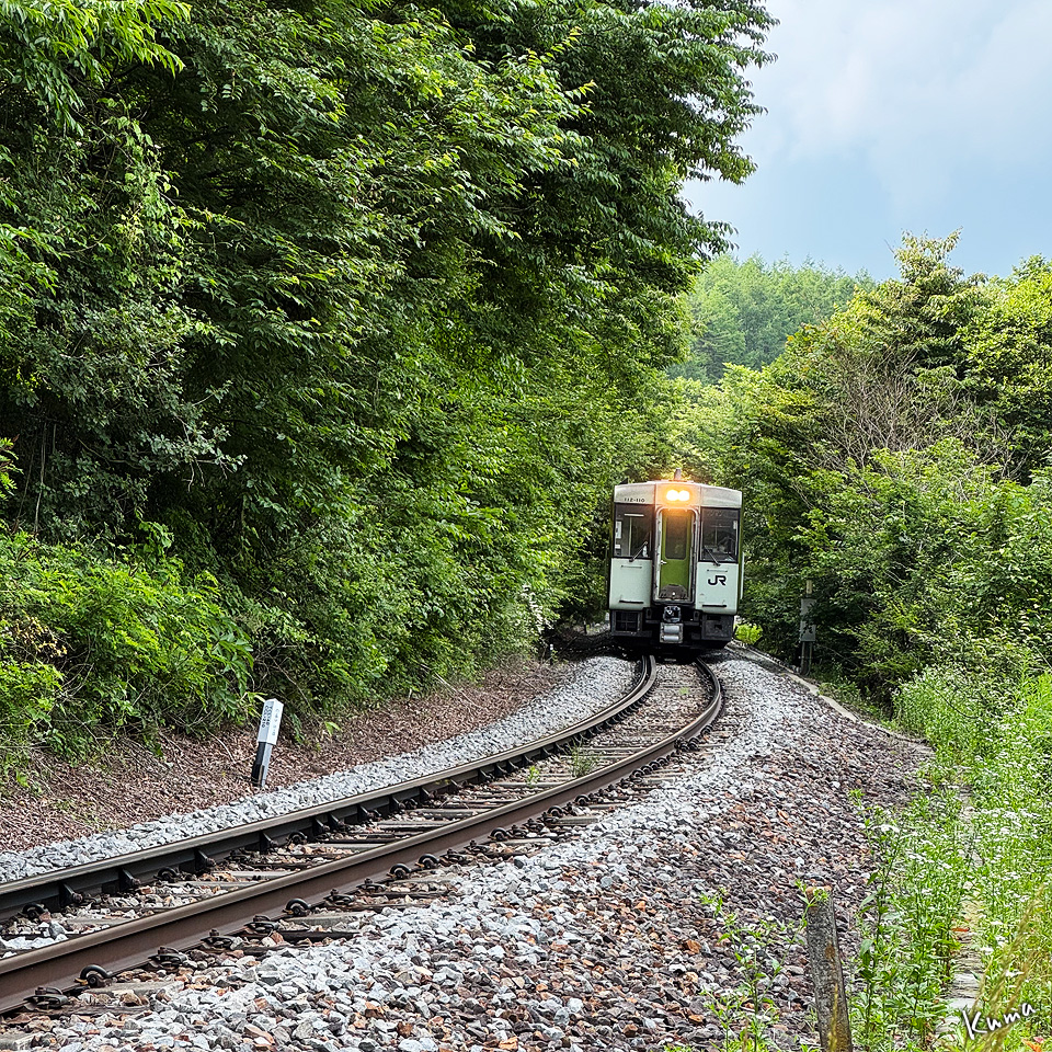 投稿日: 2025年7月29日2025年7月28日 投稿者: くまぱぱ南麓の森を走る 森の中から小海線の列車がやって来る。 ヘッドライトがとても明るく見える。 この季節の森の緑に溶け込むような車体色だ。 車両はキハ112と111の2両編成。 33‰の急勾配をかけ下り、清里駅に向かう。