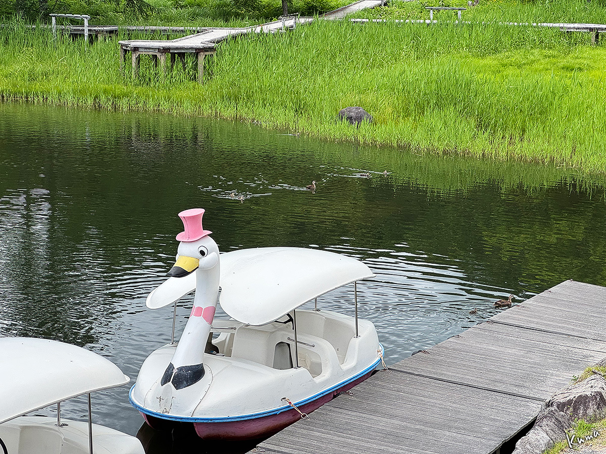 女神湖センターから木道の反対側は堤になっている。それほど広い湖ではないが、家族連れがボートで遊ぶには手頃かも知れない。