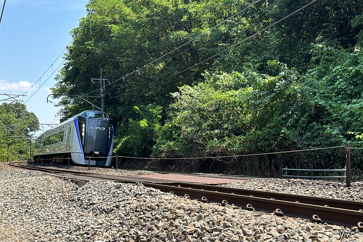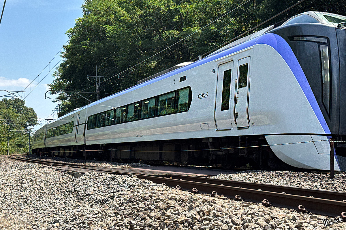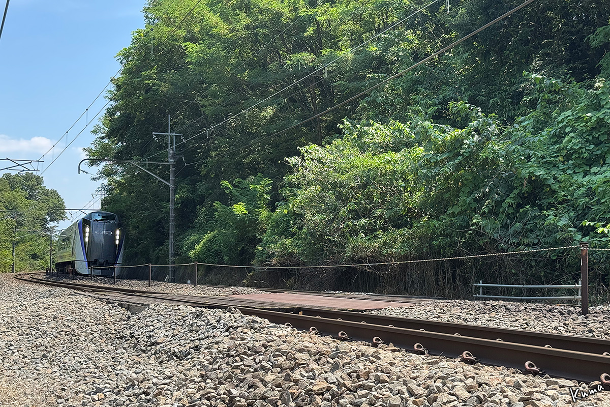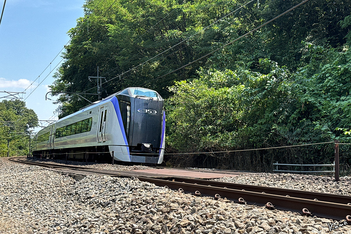 投稿日: 2025年9月2日2025年9月2日 投稿者: くまぱぱ400R 高速通過 E353系がカーブから顔を出した。 ここは韮崎から七里岩台地への登坂区間だ。 勾配は上りり25‰、曲線半径は600mだ。 時速100kmで、あっという間に駆け抜ける。 下り特急あずさ。次の停車駅は小淵沢だ。