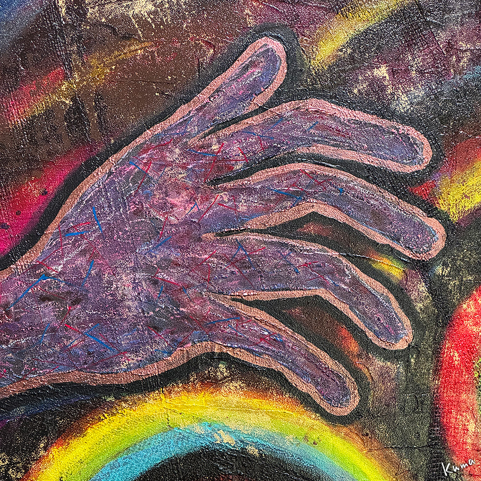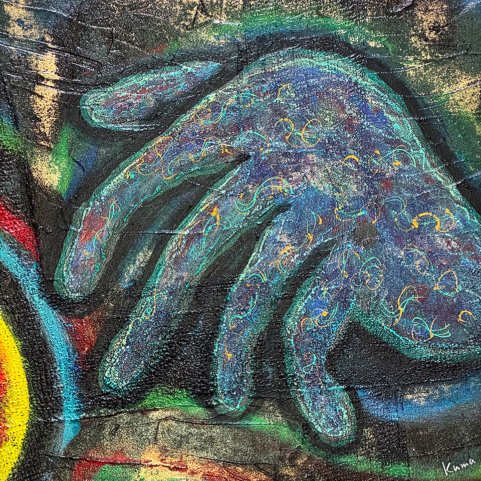 赤系の絵の右手のアップ。